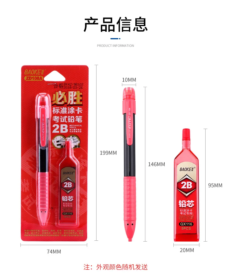 Название продукта: Baoke ZD108A Бренд: Baoke Модель: ZD108A Количество ветвей: 12 Классификация цветов: красный, синий, зеленый, оранжевый Тип ручки: специальный механический карандаш Твердость пополнения: 2B Производственные предприятия: Guangdong Baoke Канцтовары Co., Ltd. Стандарт безопасности: ГБ Национальный стандарт Применимые варианты: экзамены