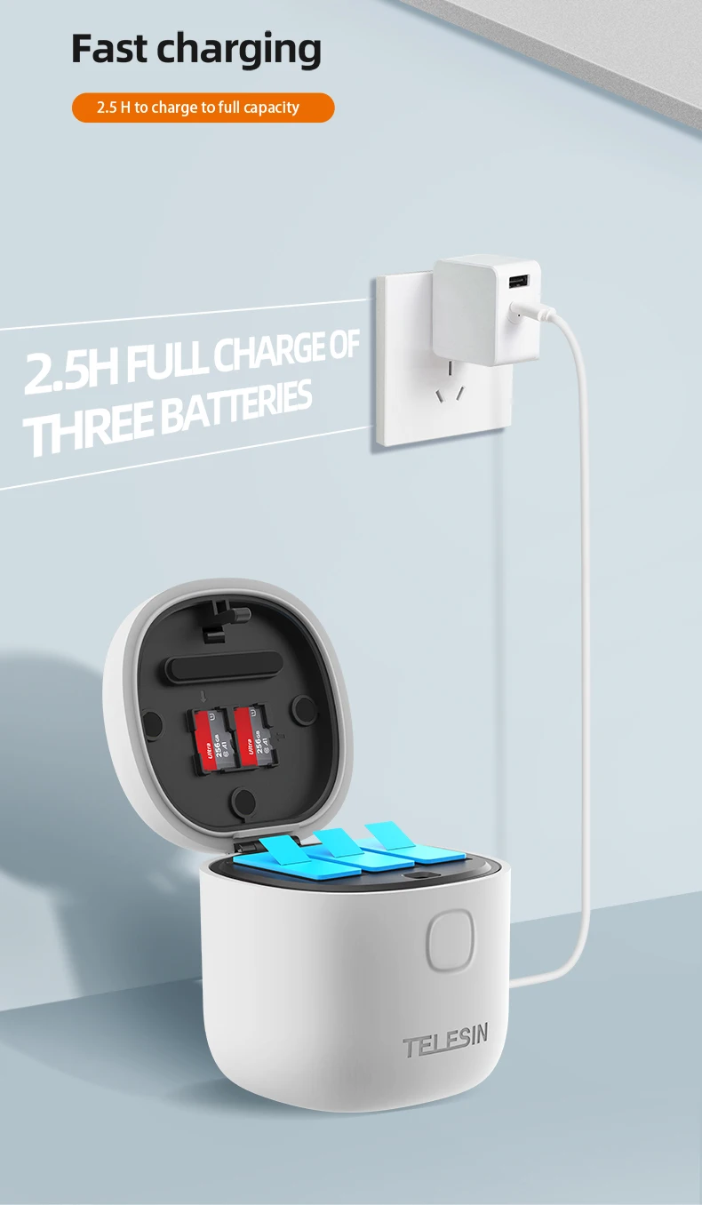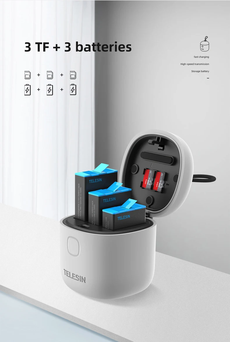 TELESIN для GoPro Hero 9 10 3 слота зарядное устройство светодиодный светильник TF кардридер для хранения зарядная коробка для GoPro Hero 9 10 черный