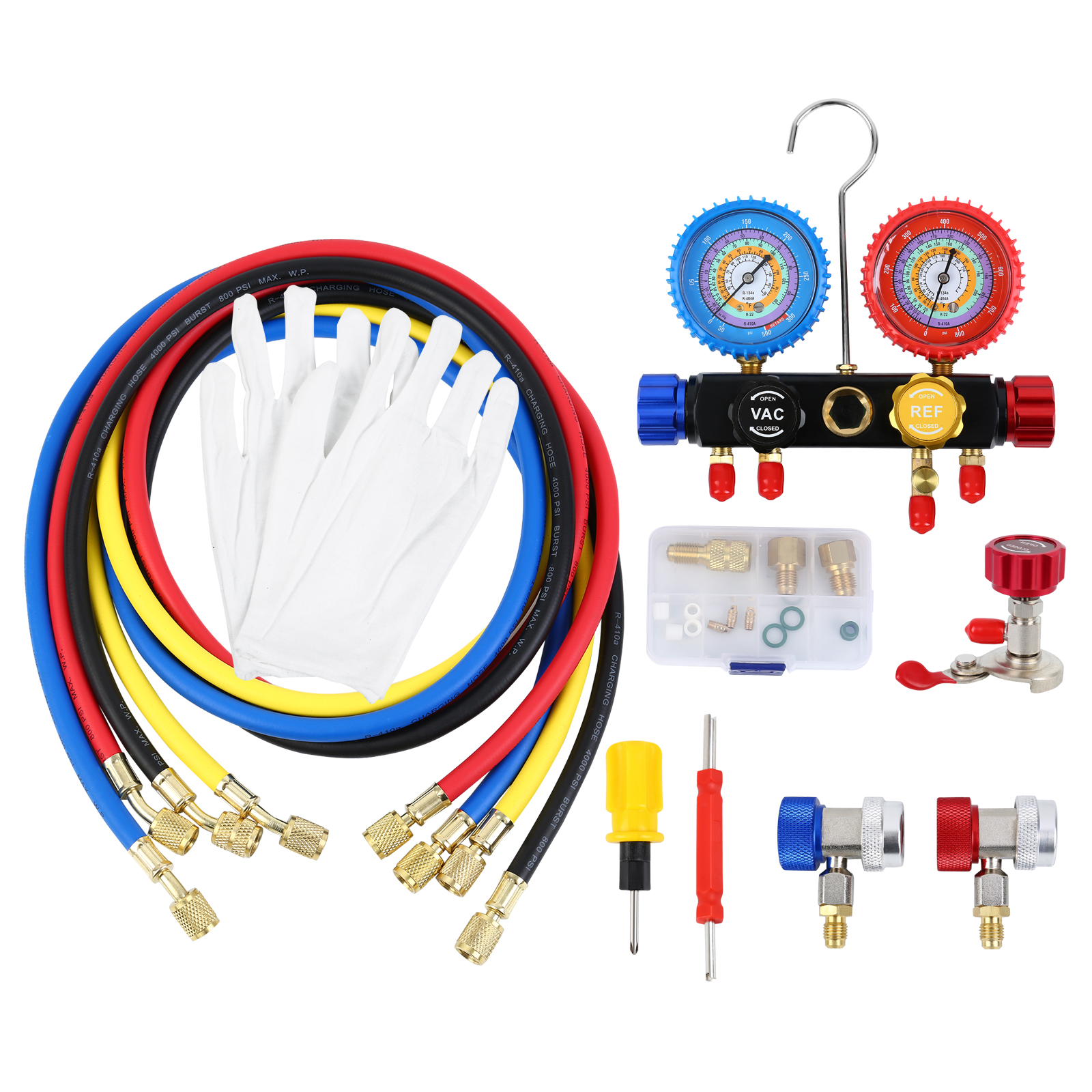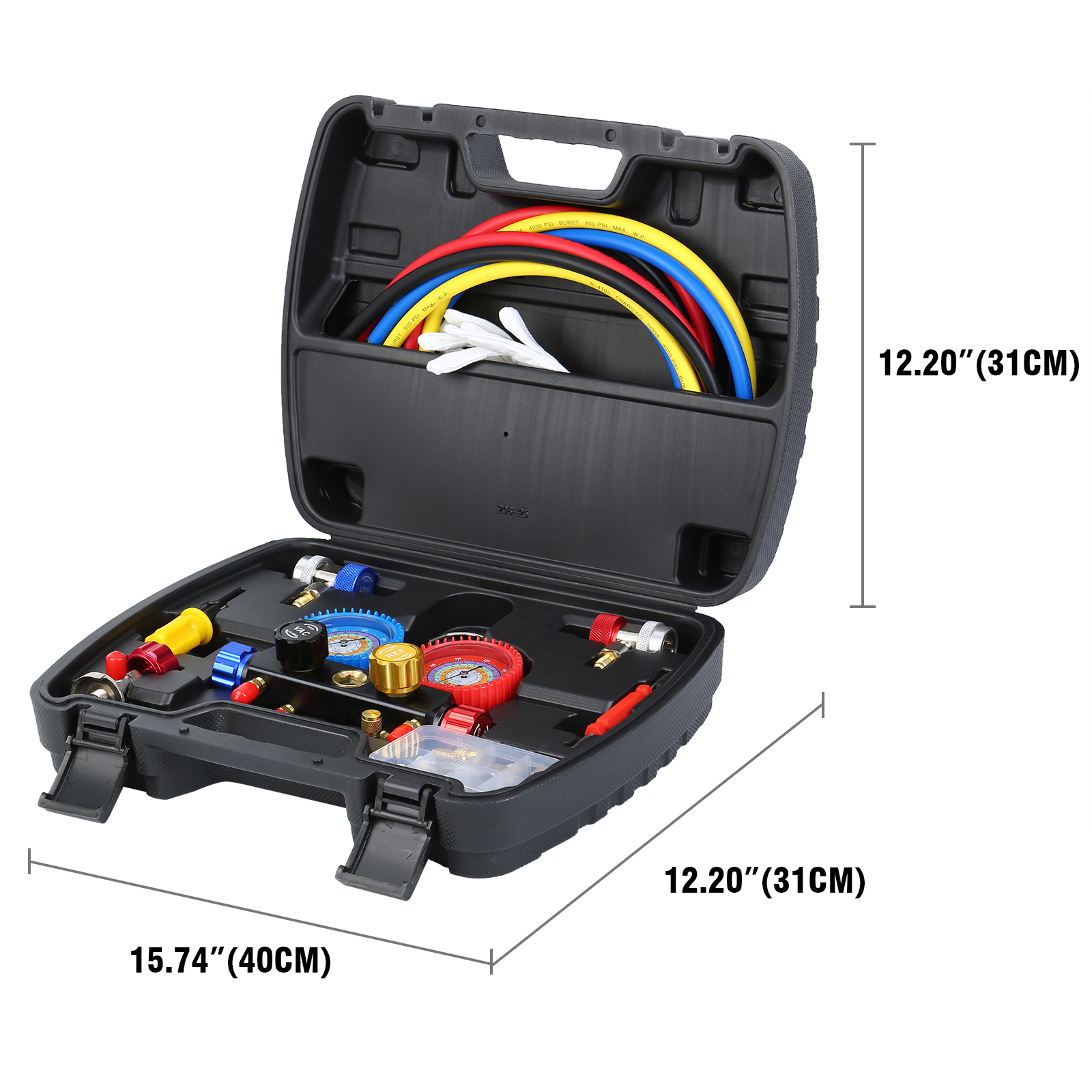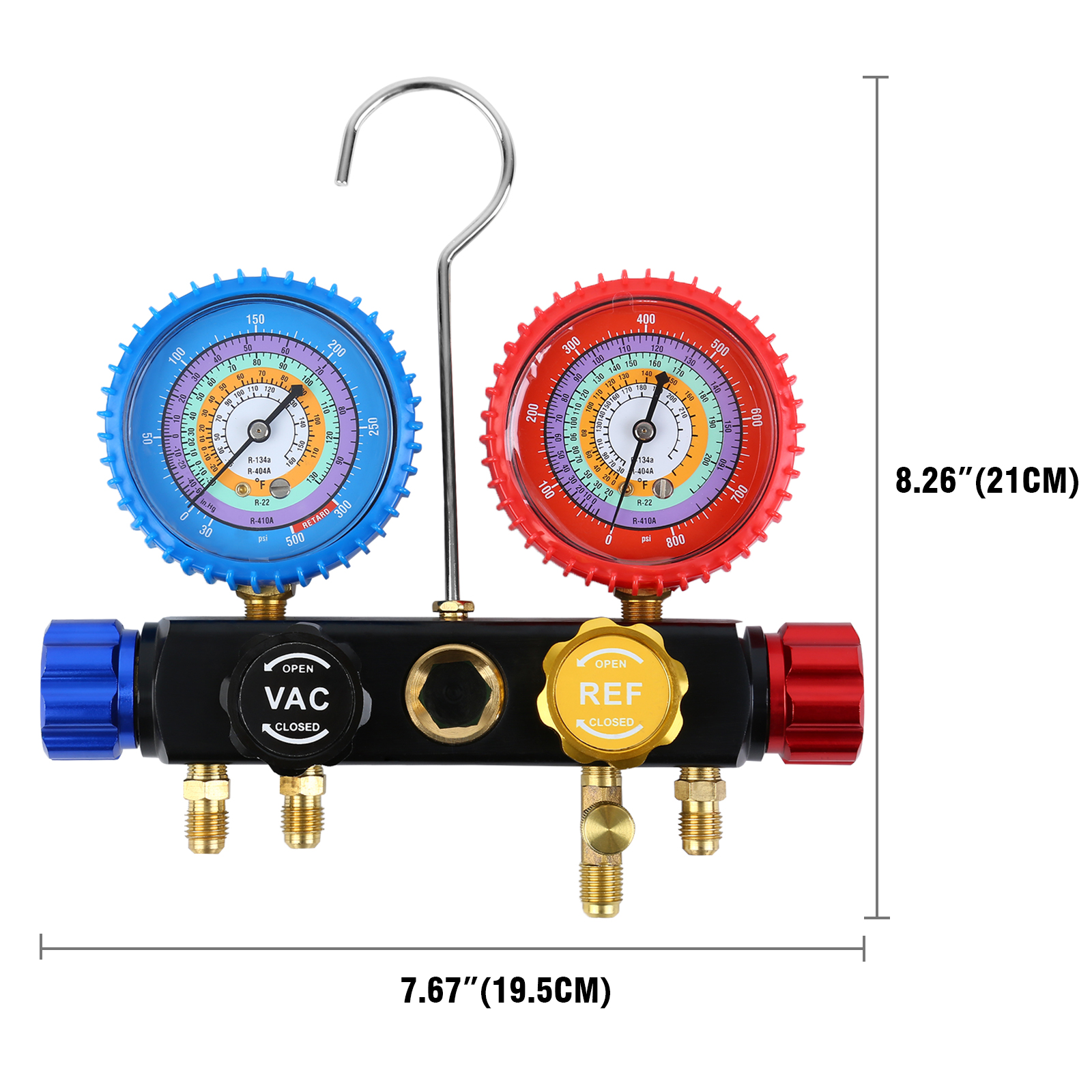 (1) многофункциональный набор инструментов переменного тока, профессиональный набор диагностических инструментов для кондиционирования воздуха в автомобиле совместим с холодильником R134A R410A R404A R22, который очень подходит для бесплатной зарядки, эвакуации, диагностический осмотр и восстановление;