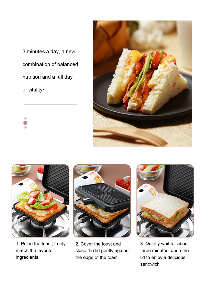 Изготовлен из алюминиевого сплава, прочный, быстрый нагрев, всего несколько минут, и вы можете получить вкусный сэндвич, который вы хотите.