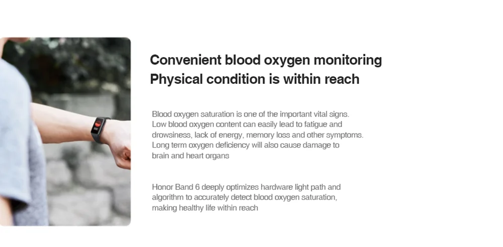 Насыщение крови кислородом является одним из важных признаков. Низкое содержание кислорода в крови может легко вызвать такие признаки, как усталость, сонливость, отсутствие энергии и потеря памяти. Длительное недостаточное содержание кислорода в крови также может привести к повреждению мозга и органов сердца. HONOR Band 6 глубоко оптимизирует аппаратный светильник и алгоритм для точного обнаружения насыщения крови кислородом, что обеспечивает здоровый образ жизни в пределах досягаемости.