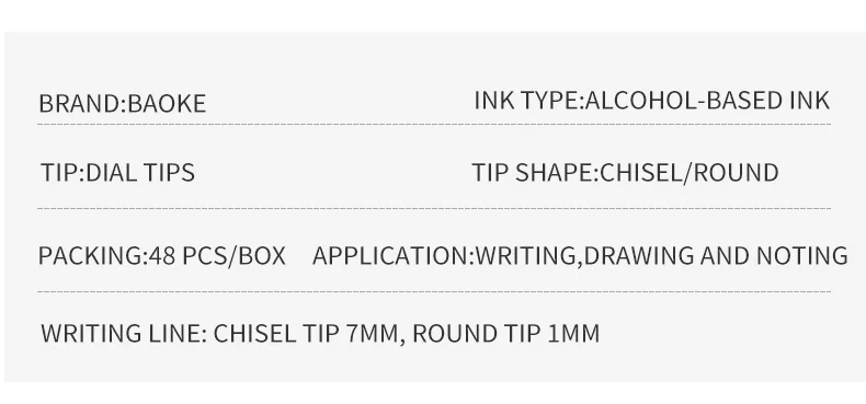Бренд: Baoke Модель Baoke: MP2924 #48 Форма: наклонная голова с круглой головкой Цветовая классификация: белый шест, 48 цветов Толщина письма: 6 мм Цвет заправки: 48 цветов Двухголовый: Да Тип ручки: масляная ручка Производственные предприятия: Guangdong Baoke Канцтовары Co., Ltd. Артикул: MP2924 #48