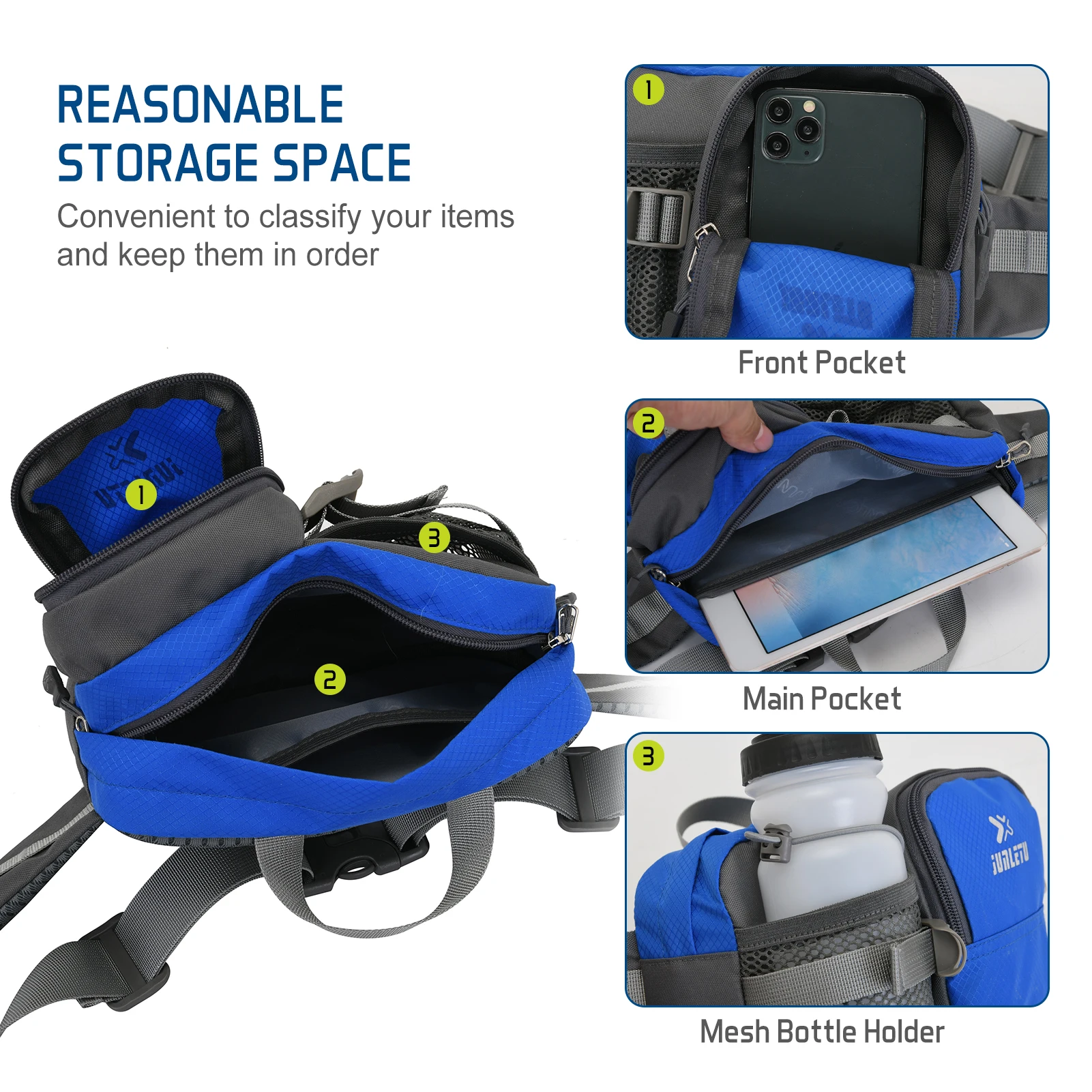 Эта поясная сумка изготовлена из устойчивой к царапинам ткани Оксфорд для обеспечения долговечности в долгосрочной перспективе. К вашим услугам основной карман на молнии, передний карман и сетчатый карман для бутылки с водой. Ремень на талии полностью регулируется для разных размеров талии. Отлично подходит для кемпинга, пеших прогулок, велоспорта, бега, фитнеса, шопинга и других видов спорта на открытом воздухе.