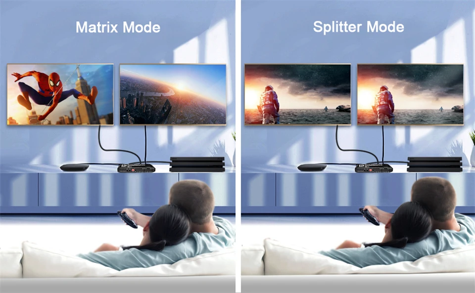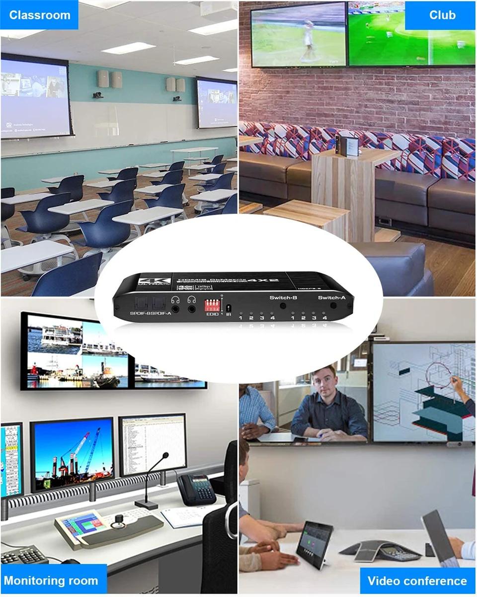 [4 In 2 Out HDMI Matrix] HDMI matrix позволяет подключать четыре источника сигнала 4K HDR к двум hd-дисплеям или проекторам одновременно. Это комбинация HDMI сплиттера и переключателя. Любой выходной порт может осуществлять независимый аудиовыход с помощью SPDIF/оптического волокна или L/R стерео наушников. Корпус из алюминиевого сплава обеспечивает долговечность и способствует отводу тепла. Удобно для работы и домашнего использования, распределения информации, презентаций в конференц-зале, в школе и в условиях корпоративного обучения.