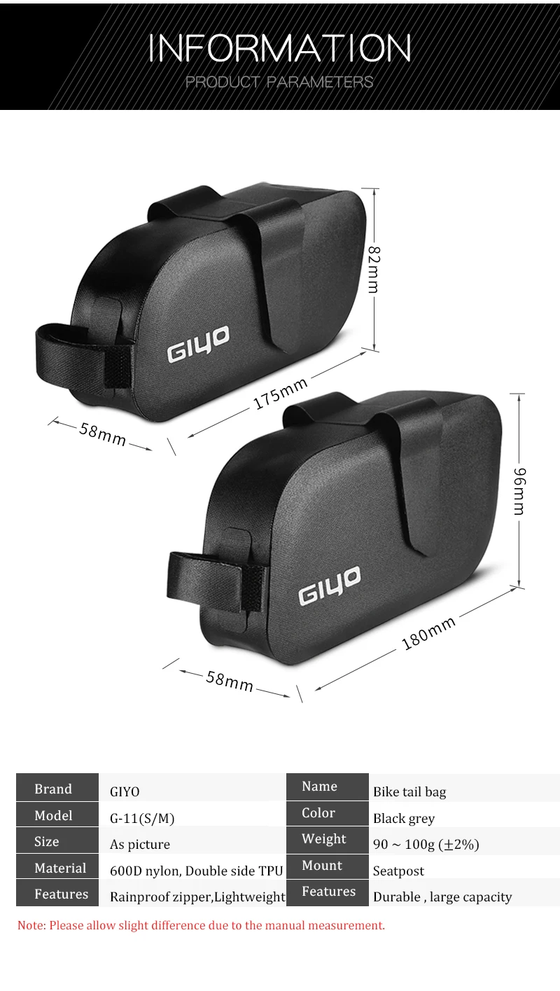 [Информация] Модель: G-11 Вес: около 90-100 г Размер: S / L Цвет: черный Материал: нейлон 600D, двустороннее водонепроницаемое покрытие из ТПУ; Применение: Горный, дорожный велосипед... почти для всех велосипедов. [Характеристики] 1. Защита от дождя для всей сумки включает молнию; 2. Прочный материал и легкий вес; 3. Большая емкость для повседневной необходимости; 4. Хороший дизайн, подходит для большинства велосипедов.