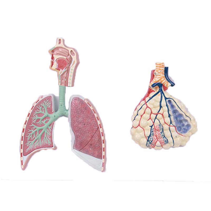 Эта модель показывает дыхательные пути, полость носа, ротовую полость к трахее, бронху и правому бронхиальному дереву, входящему в легочную кость. Увеличенная альвеолярная модель также прикреплена, показывая гистологическую микроскопическую структуру альвеоли, которая может объяснить процесс газообмена.