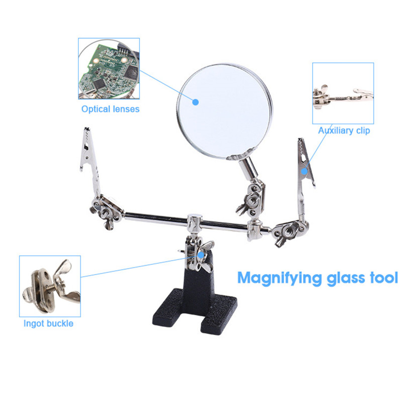 При пайке печатной платы иногда угол печатной платы трудно ухватить и неуклюже. С ним, это более удобно. Печатная плата может быть закреплена маленькими зажимами, чтобы свободно вращаться в трех размерах. Дополнительное увеличительное стекло делает вашу сварку более удобной и экономит время.