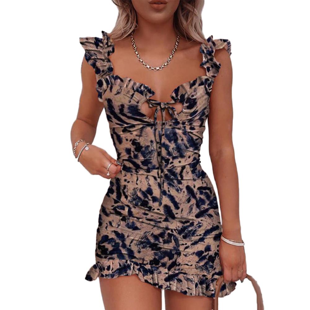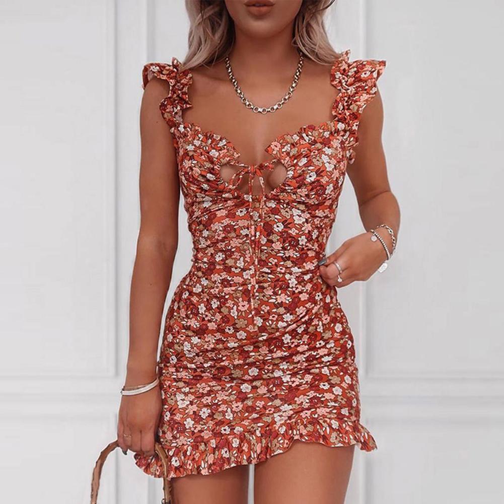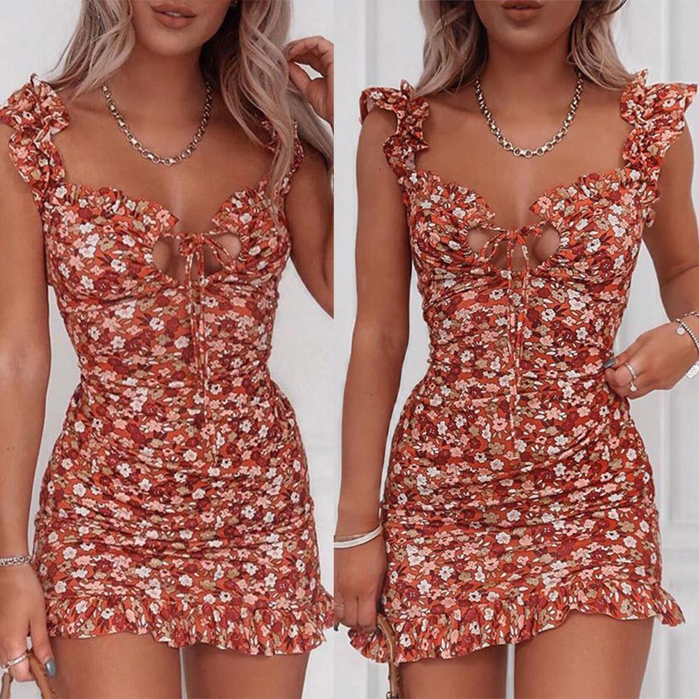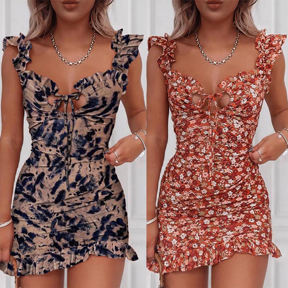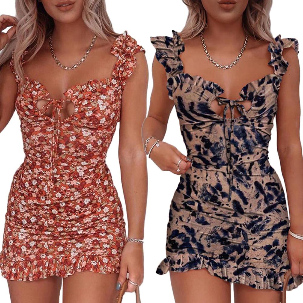 Женские сексуальные лямки с оборками с цветочным принтом на груди, облегающие вечерние мини-платья