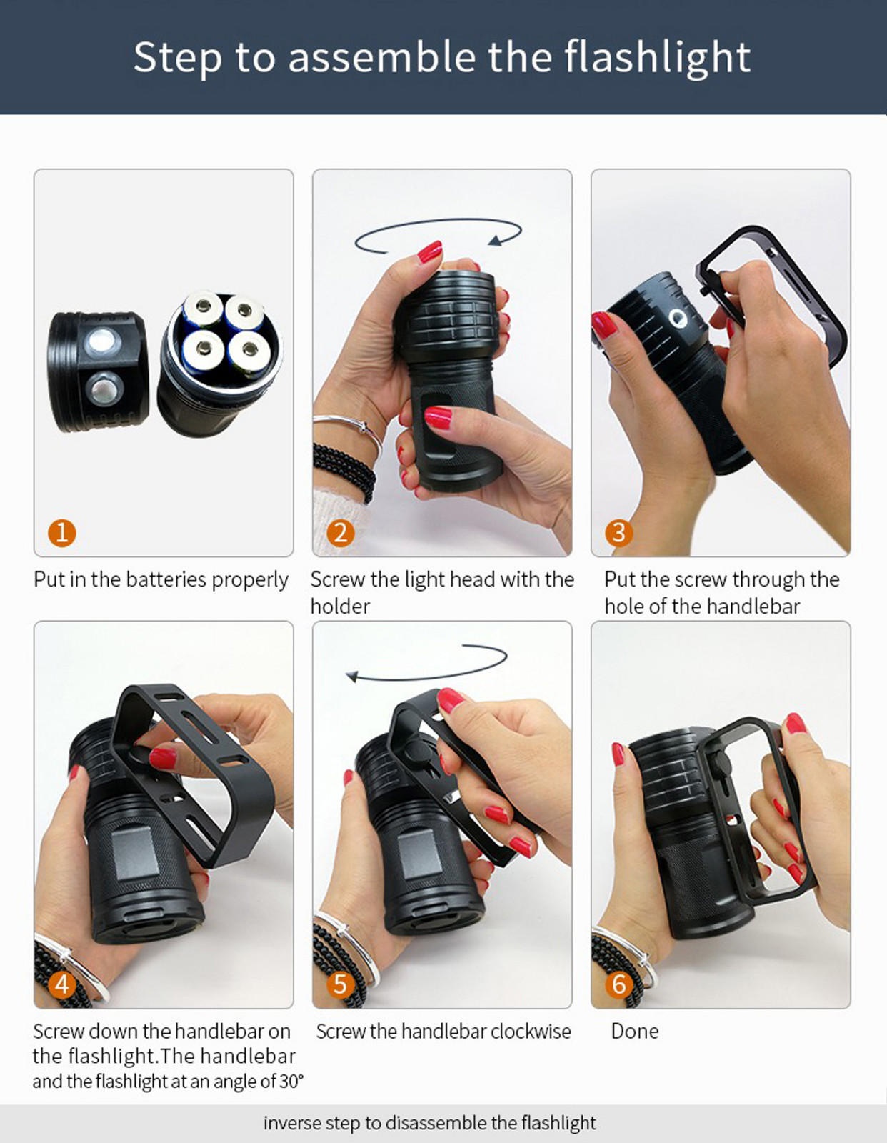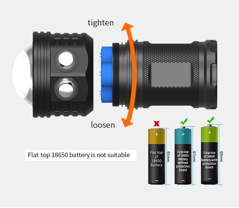 НЕТ: этот фонарик для дайвинга очень мощный. Не используйте его в течение длительного времени дома (не может превышать 5 секунд), в противном случае это приведет к перегреву и повреждению фонарика.