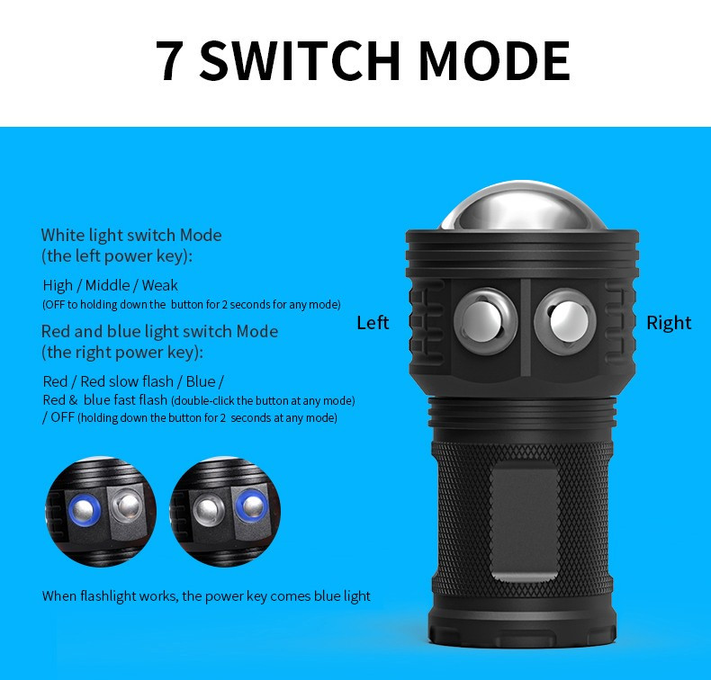 Режим переключения красного и синего света (правая клавиша питания): красный/красный медленная вспышка/синий/красный быстрая вспышка (дважды нажмите кнопку в любом режиме)/Выкл (удерживайте кнопку в течение 2 секунд в любом режиме)