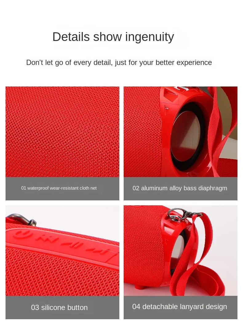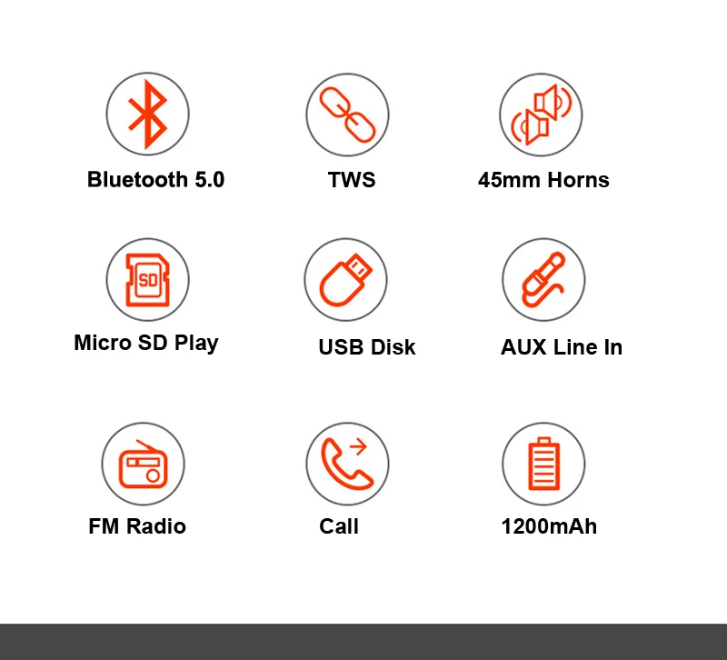 1. Новый товар и высокое качество. 2. Портативный съемный и регулируемый плечевой ремень длиной до 120 см. 3. Сетчатая крышка для защиты динамика от воды, пыли, ударов. 4. IPX6 водонепроницаемый, пыленепроницаемый, ударопрочный. 5. Большая мощность 5 Вт с двумя басовыми диафрагмами на каждой стороне, вибрирует при воспроизведении музыки. 6. Bluetooth 5,0, совместим со всеми устройствами Bluetooth. Быстрое подключение и стабильная работа. 7. Функция вызова, микрофон с шумоподавлением позволяет отвечать на звонки, не доходя до телефона. 8. Встроенный модуль fm-радио, который может автоматически искать и хранить радиостанции, экономя время и усилия. 9. Поддержка MP3, WMA, WAV, FLAC, APE форматов музыкальных файлов. 10. Аккумулятор емкостью 1200 мАч обеспечивает до 6 часов воспроизведения при 2/3 громкости при полной зарядке. 11. Поддержка внешних MP3 / MP4/компьютера и других функций аудиовхода (AUX) 12. Функция TWS, вы можете подключить два динамика с одной синхронизацией телефона. 13. Простое управление кнопками, вы можете нажать кнопки для включения/выключения, воспроизведения/паузы, режима переключения, пропускать песни, регулировать громкость и т. Д.