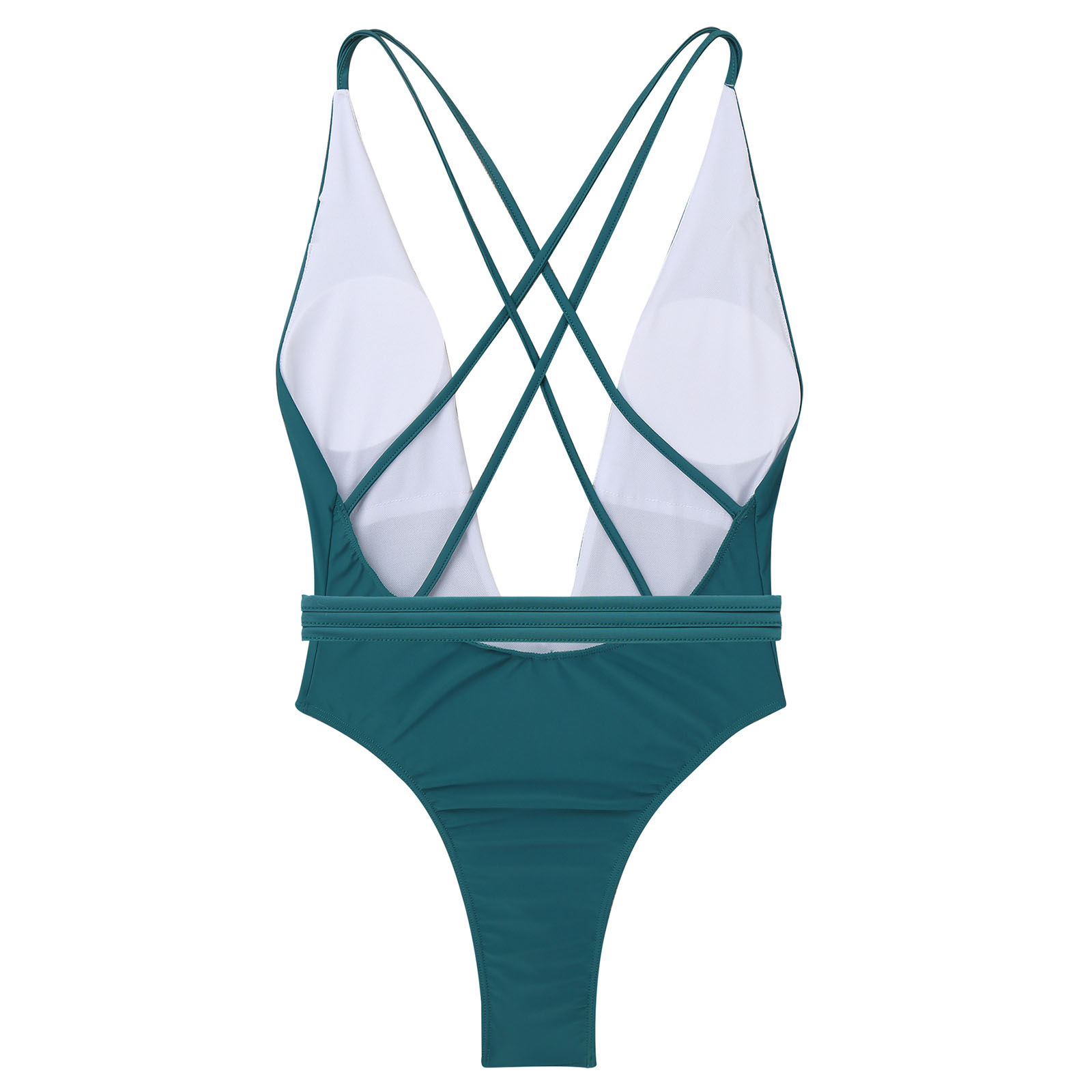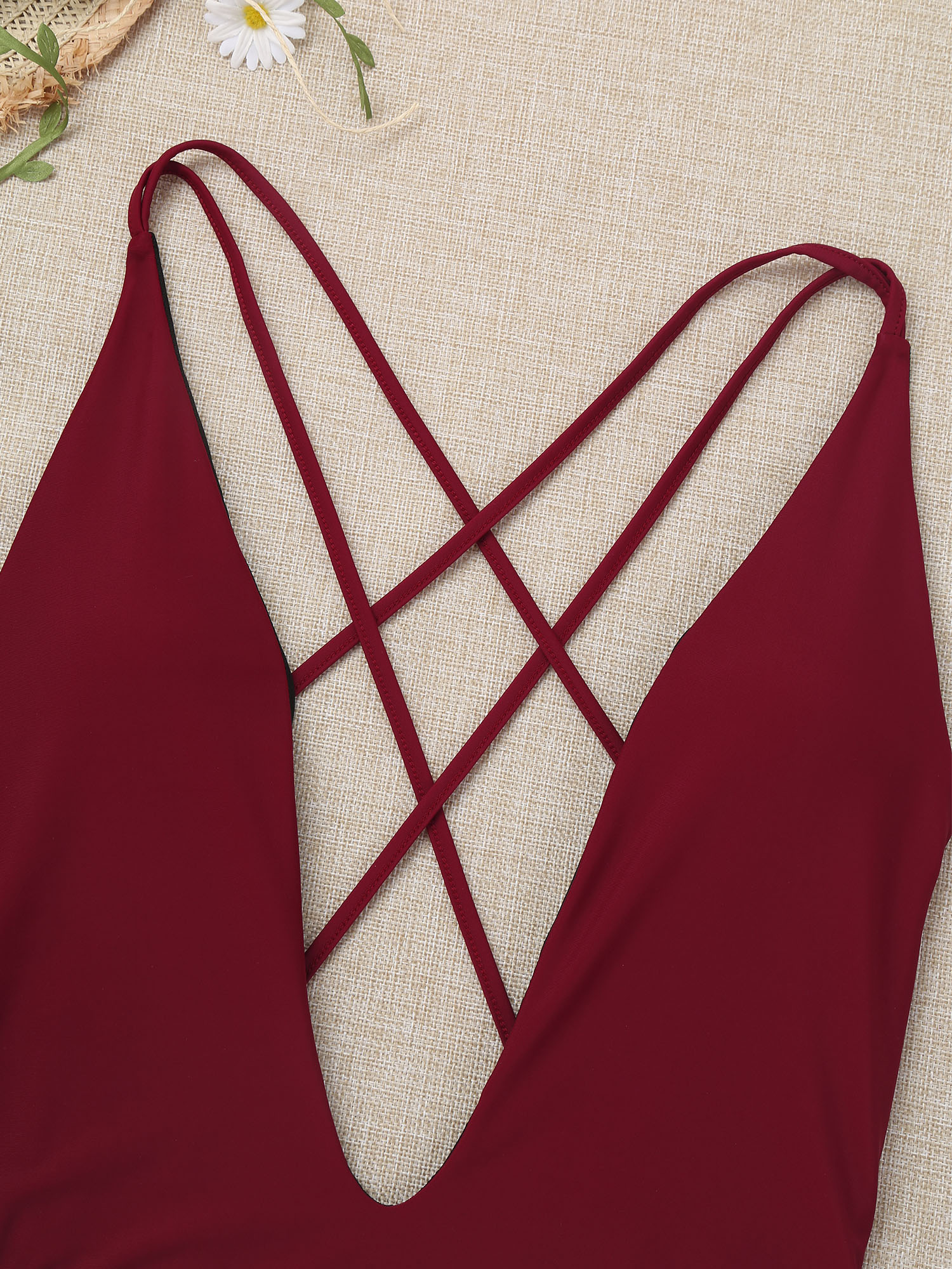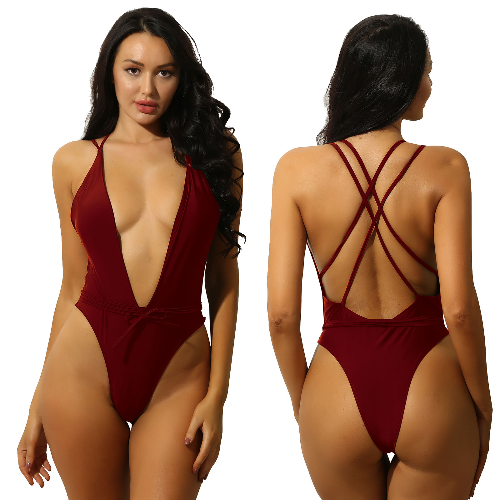 Женский купальник-бикини с глубоким v-образным вырезом и открытой спиной.