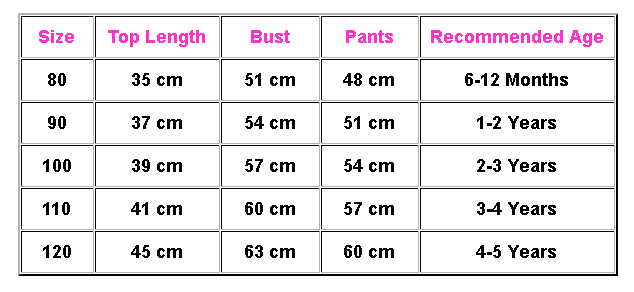 Размер Длина верха Бюст Брюки Рекомендуемый возраст 80 35 см 51См 48 см 6-12Месяцев 90 37 см 54См 51 см 1-2 года