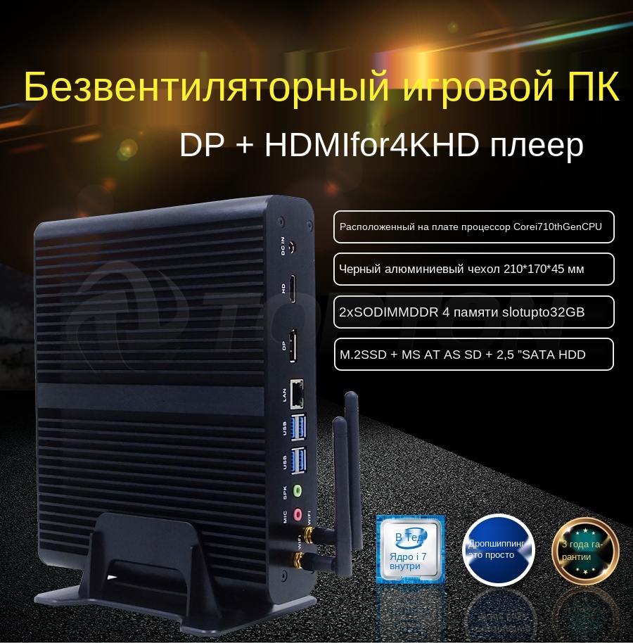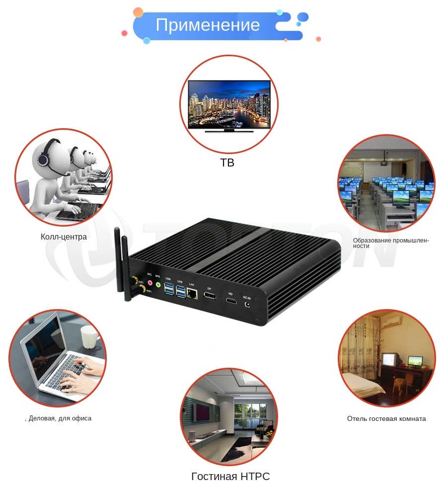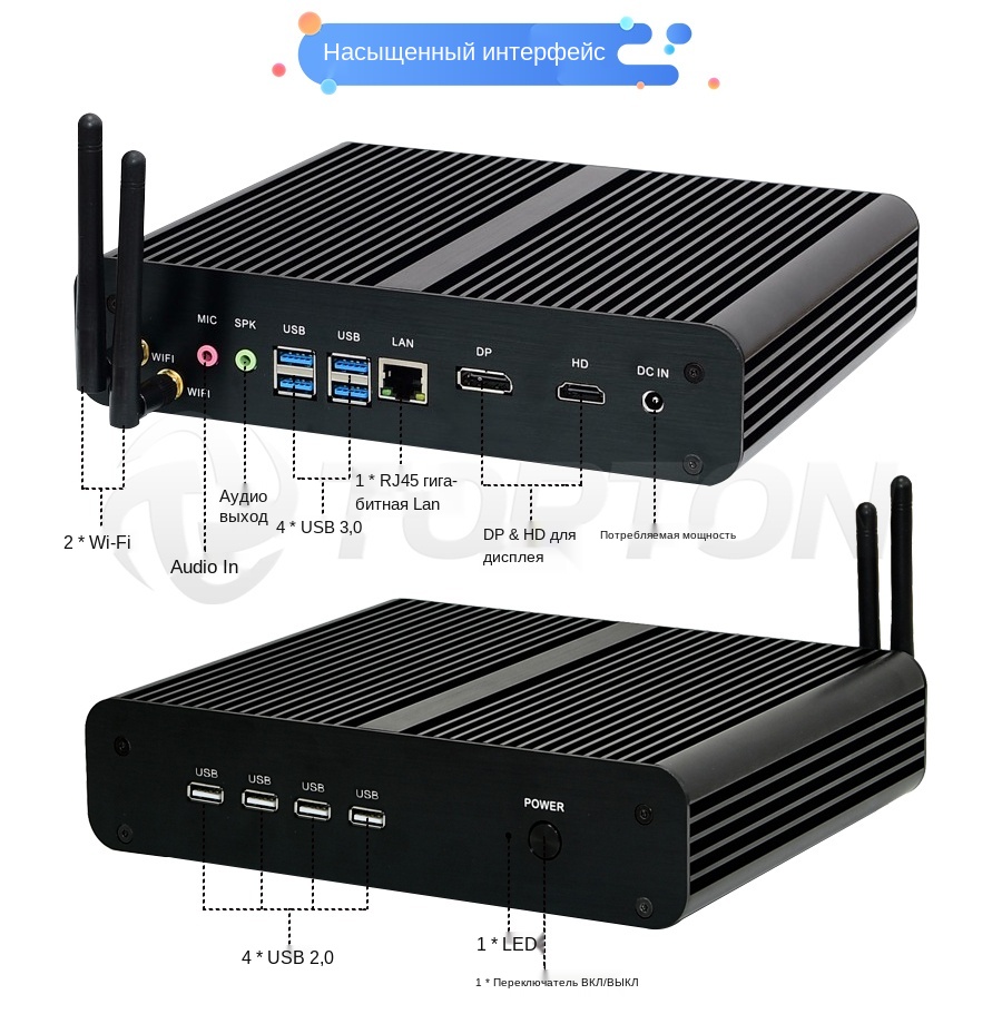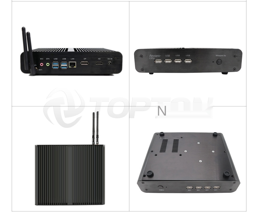 Микрофон; Динамик; 4 порта USB 3,0;4.* USB 2,0 порт; 1 * RJ45 гигабитный LAN порт; 1 * VGA(DP); 1 * HDMI; 1 * DC вход;