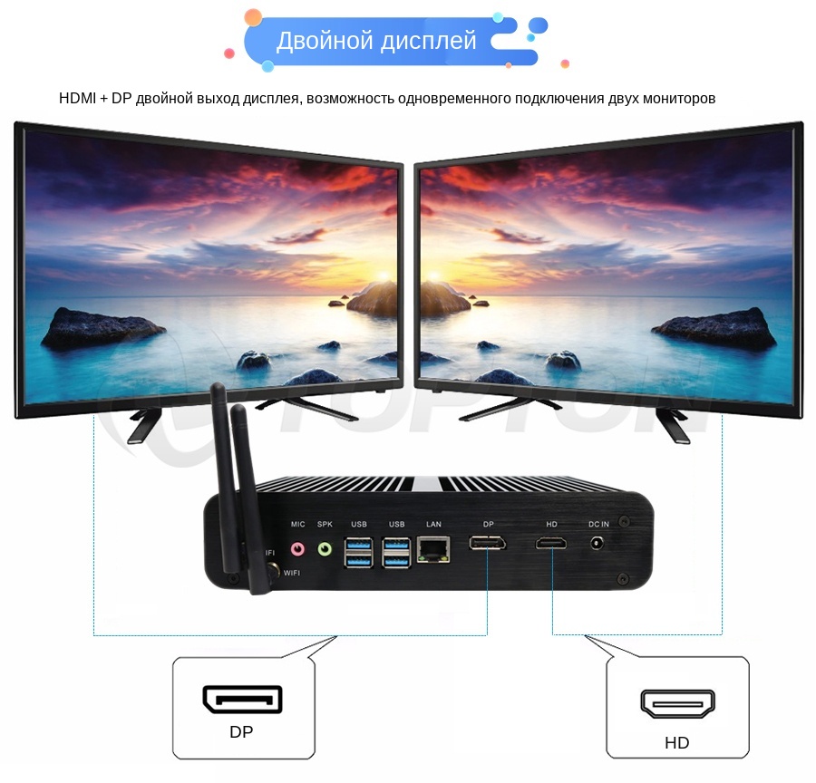 1 * HDMI порт, 1 * DP порт, поддержка HDMI + DP двойной дисплей