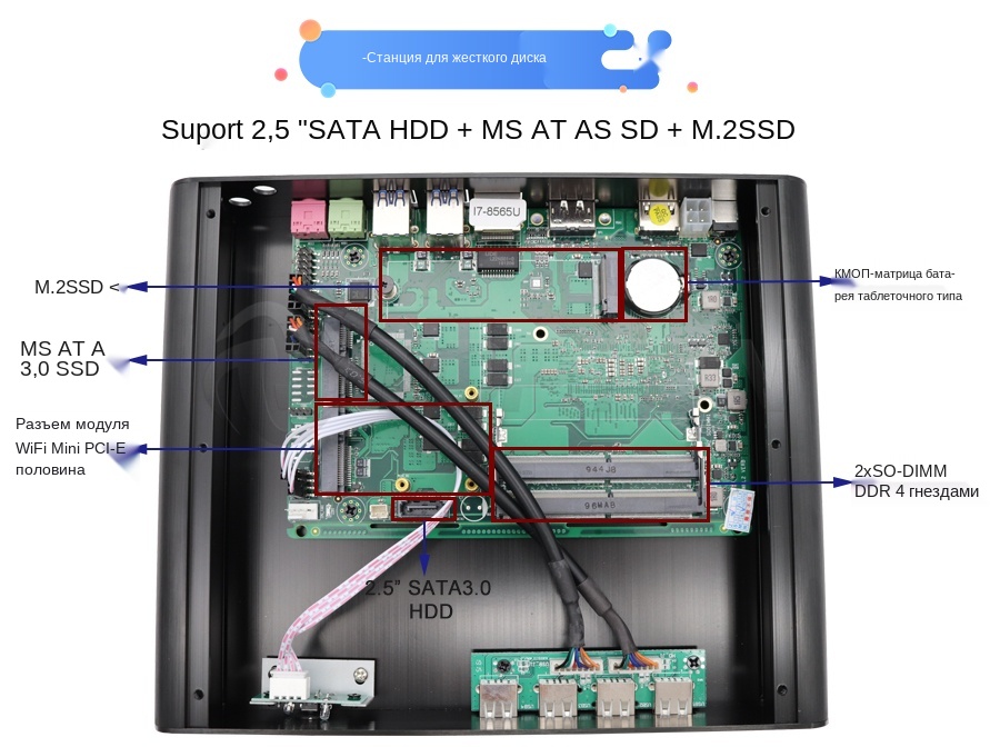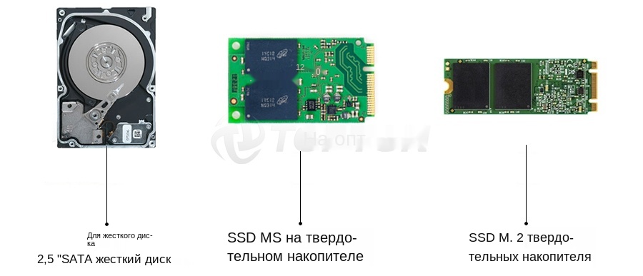 Поддержка 1 * mSATA SSD + 1 * M.2(NVMe) SSD + 1*2,5 ''SATA HDD/SSD установка вместе