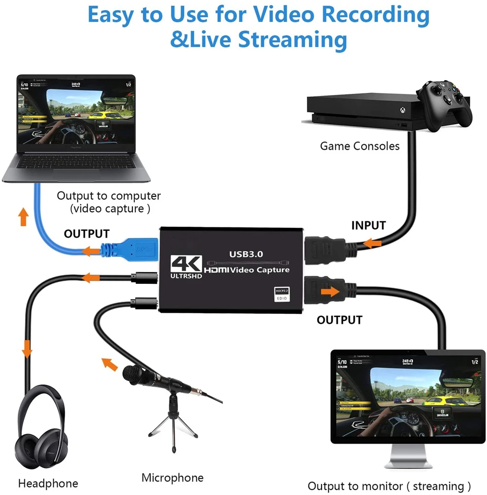 【 Легко носить с собой и хорошая совместимость: 4K @ 60Hz HDMI до USB3.0 карта видеозахвата, легко носить с собой, высокая производительность, хорошая совместимость, простая установка, мощные функции и т. д., можно собрать 1 входной сигнал HDMI