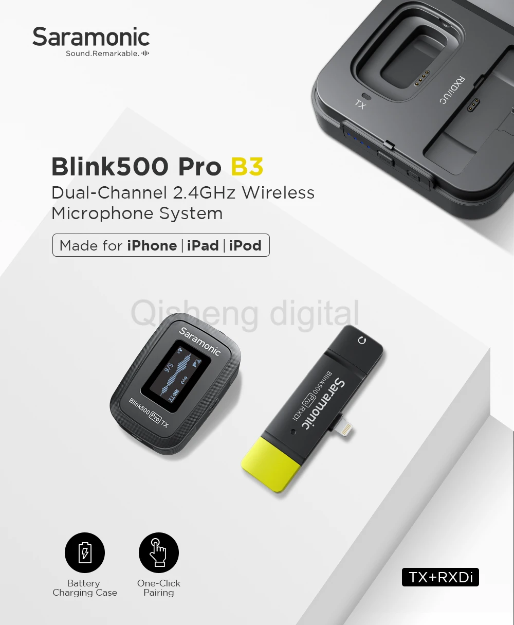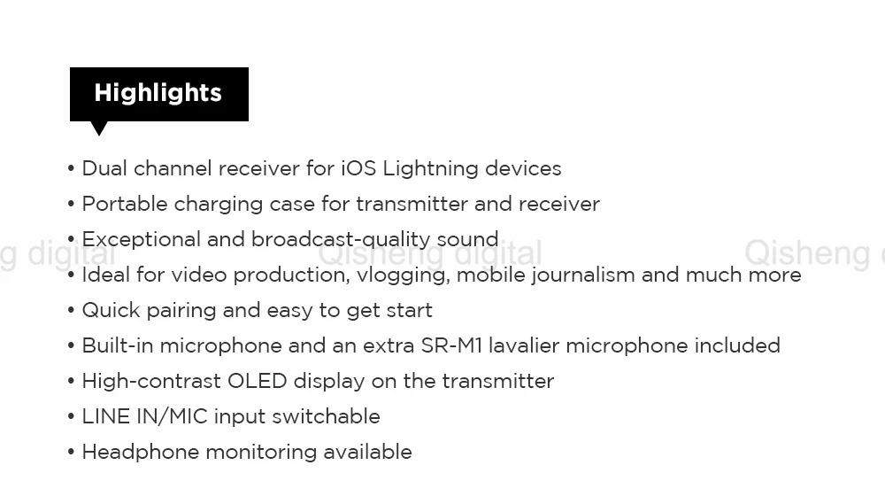 С мониторингом наушников, функция моно/стерео переключения, интерфейс Lightning, специальный двухканальный 2,4G для двух беспроводных микрофонов для iPhone
