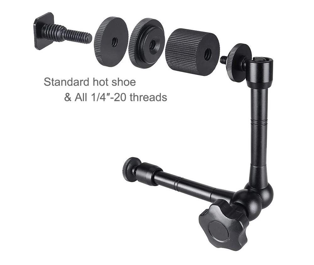 MAGIC ARM-одна сторона имеет 1/4 "винт, соединяющийся с монитором, светодиодный светильник или другие аксессуары. Другая сторона-это квадратное крепление для горячего башмака, которое можно легко установить на камеру DSLR. И это крепление для горячего башмака является съемным, чтобы стать еще одним винтом 1/4 ", поэтому оба конца-винт 1/4", который вы можете подключить к различному оборудованию.