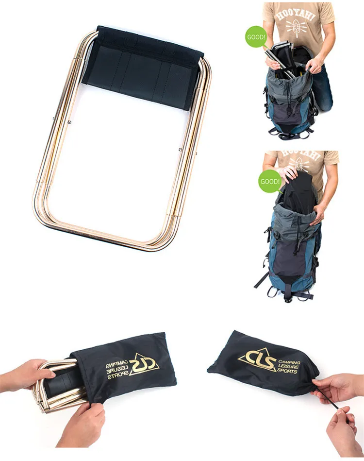Ультра-светильник из алюминиевого сплава портативный складной стул, складная рыбалка стул для кемпинга, пикник барбекю пляжное сиденье, сумка для хранения Средний размер: Размер: 24,8*22,5*27 см После складывания: 30*16,5 см Вес: 300 г (включая посылка) Несущая нагрузка: 80 кг Большой размер: Размер: 30*25,5*31,5 см После складывания: 30*16,5 см Вес: 400 г (включая посылка) Нагрузка: 100 кг Посылка: 1 Портативный Табурет, 1 сумка для хранения