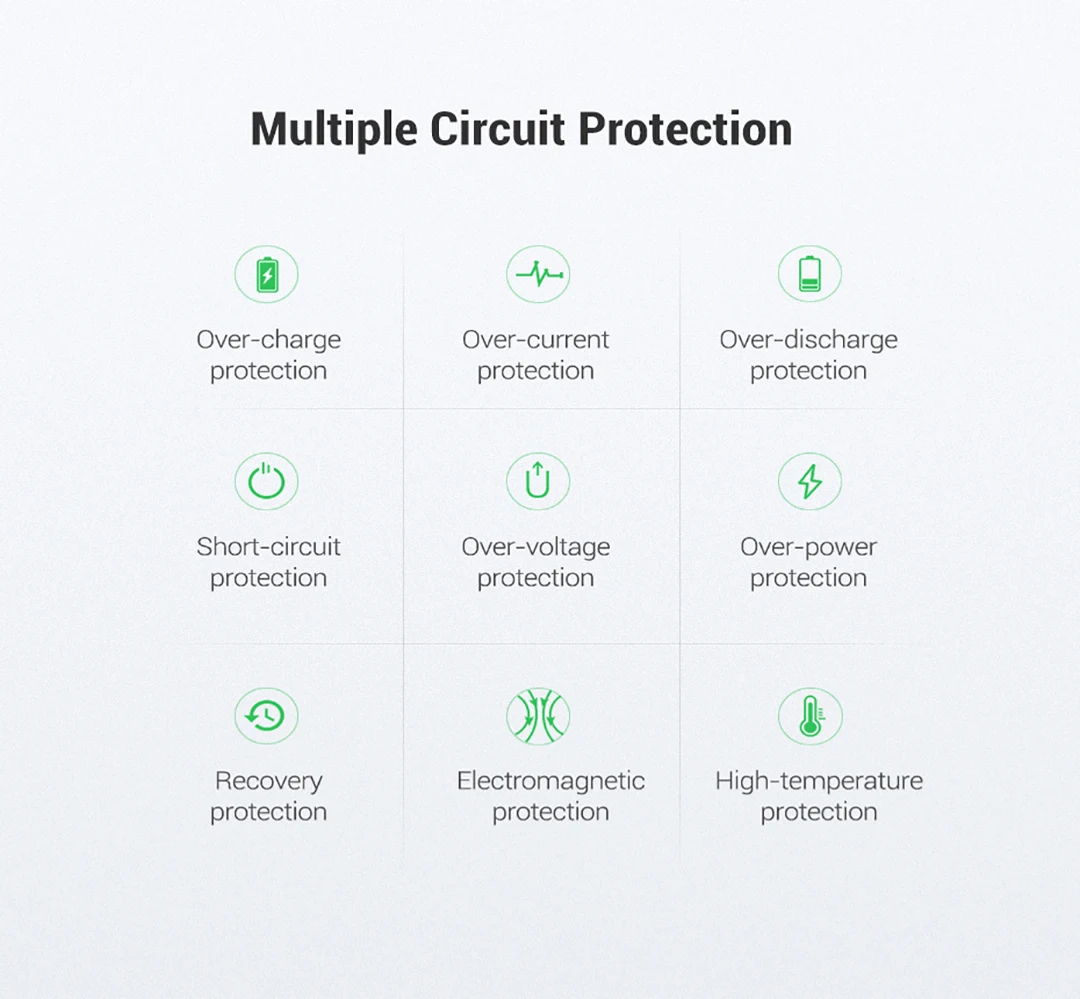 2. Безопасная зарядка и множественная защита: зарядное устройство поддерживает защиту от перезарядки, короткого замыкания и