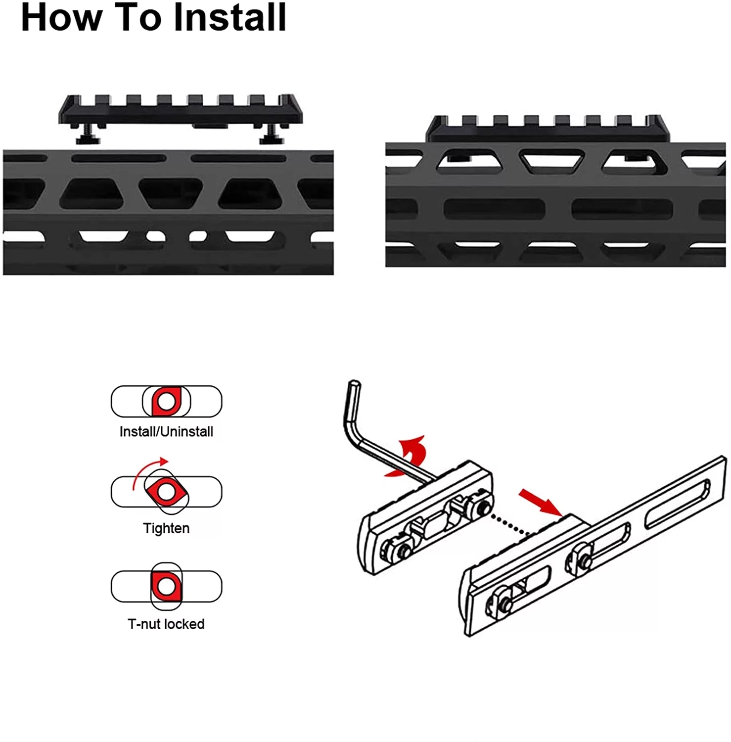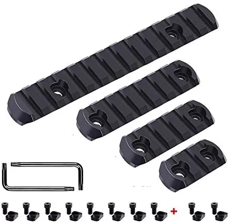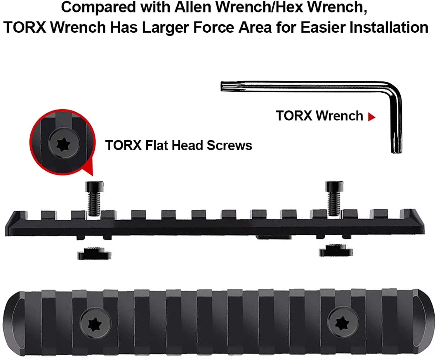 Picatinny рельсы предоставляют вам 10 комплектов винтов TORX с плоской головкой, 10 комплектов стопорных Т-образных гаек (бесплатно 2 дополнительных комплекта винтов и Т-образных гаек).