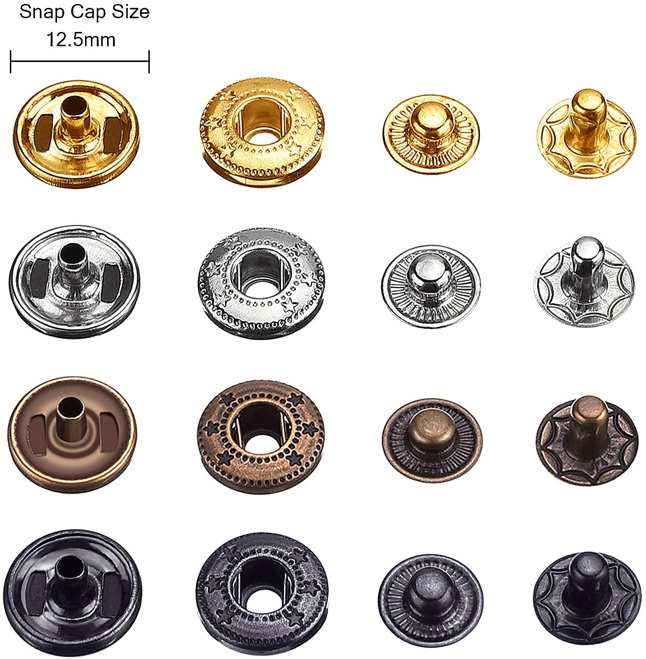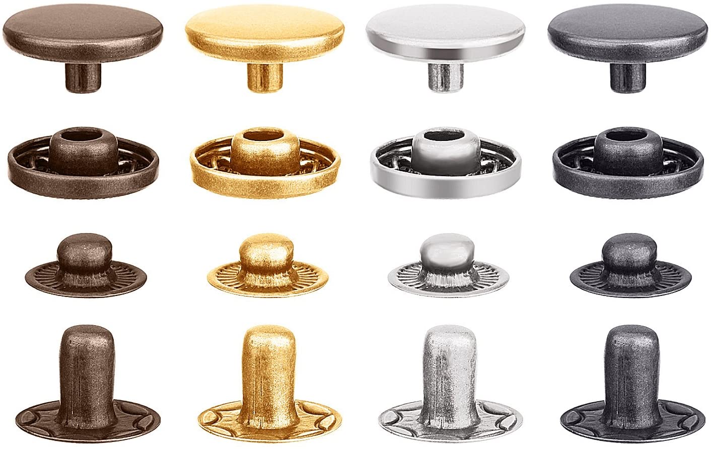 Эти пресс-шпильки включают в себя 4 цвета: золото, серебро, бронза и металл, 25 наборов защелок каждого цвета (каждый комплект застежек включает 2 колпачка, шпильку и гнездо), всего 100 наборов нажмите шпильки в посылка; Поставляется с коробкой для хранения, позволяет быстро находить эти компоненты.