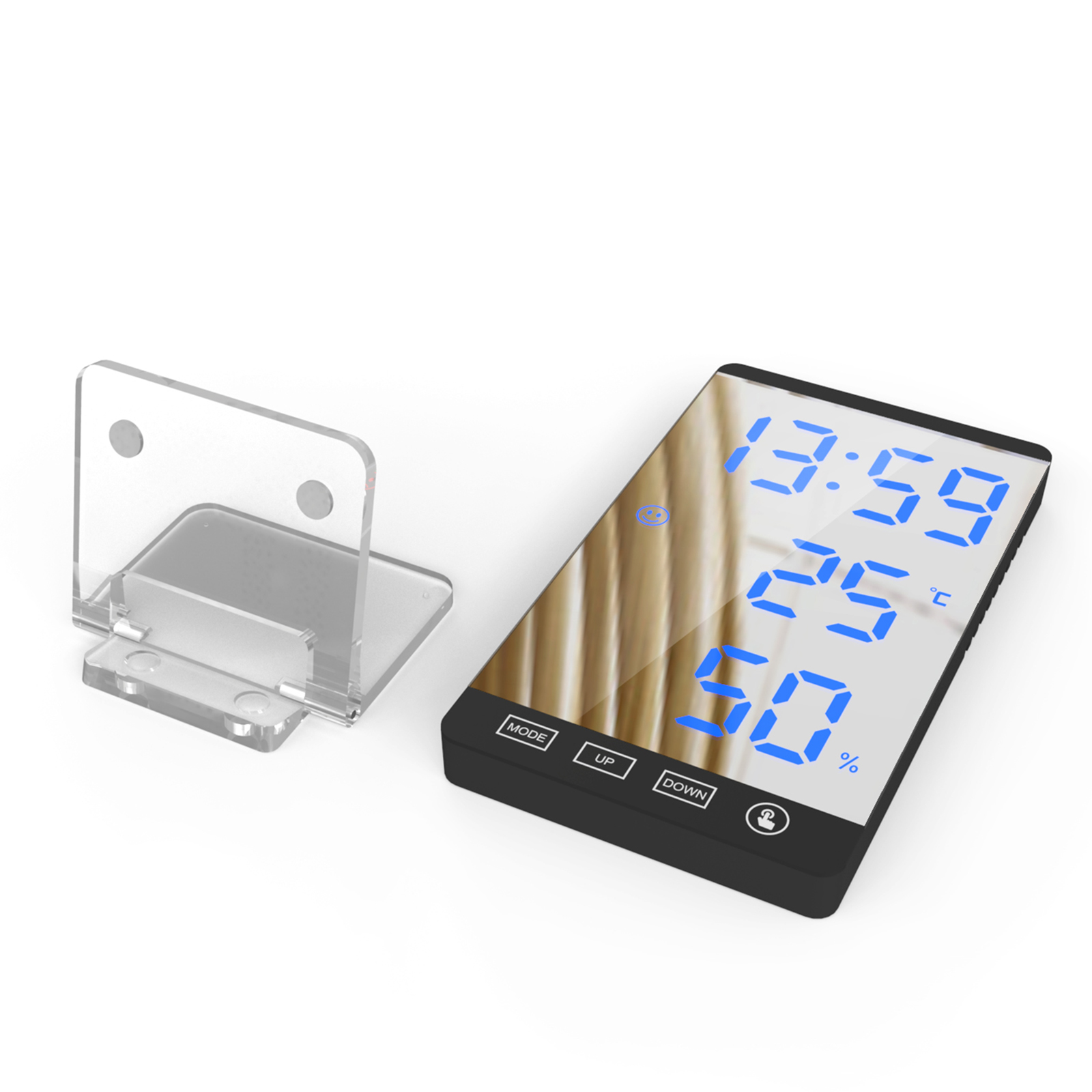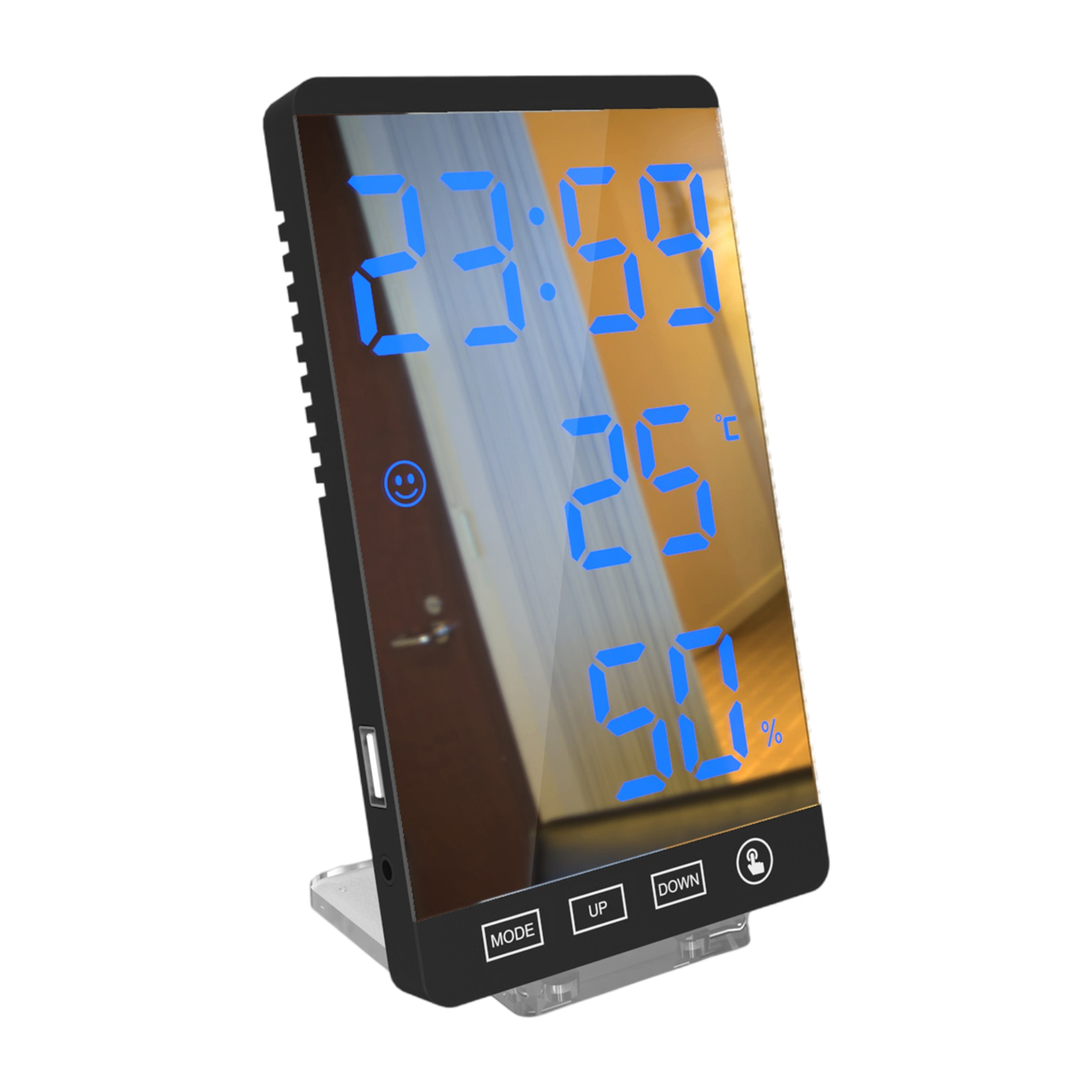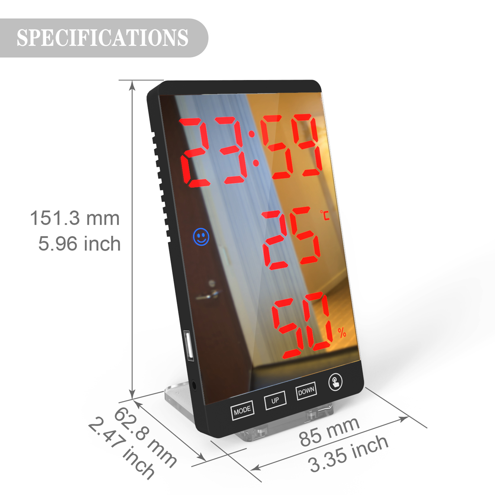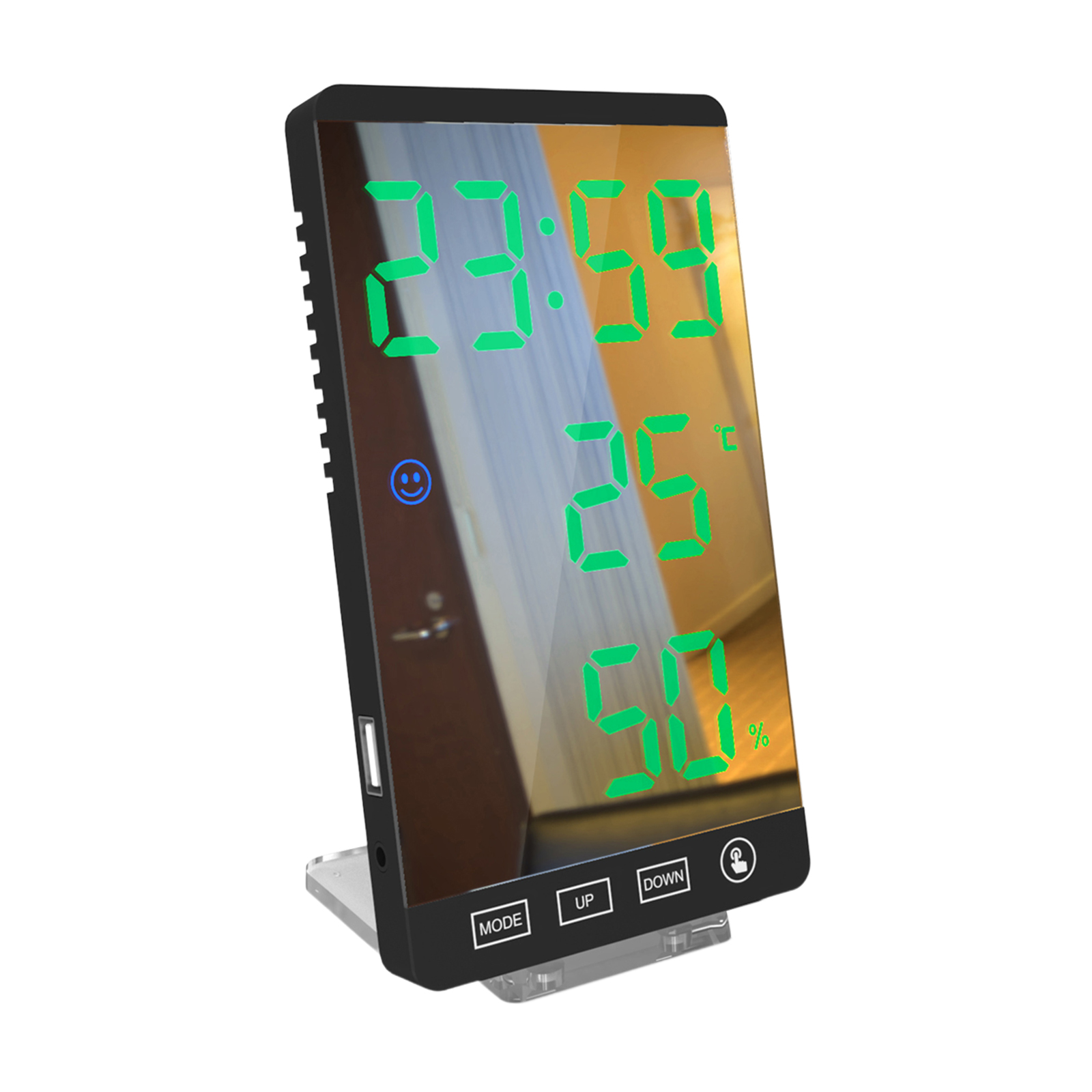 Зеркальные погодные часы могут четко показать вам время (формат 12/24 часов), данные о температуре и влажности в режиме реального времени, позволяя данные о yoution для поддержания здоровья. Удобная икона лица (синий комфорт, зеленый знать интерьер умеренность, красный некомфортность) может показать Вам комфортный уровень непосредственно.