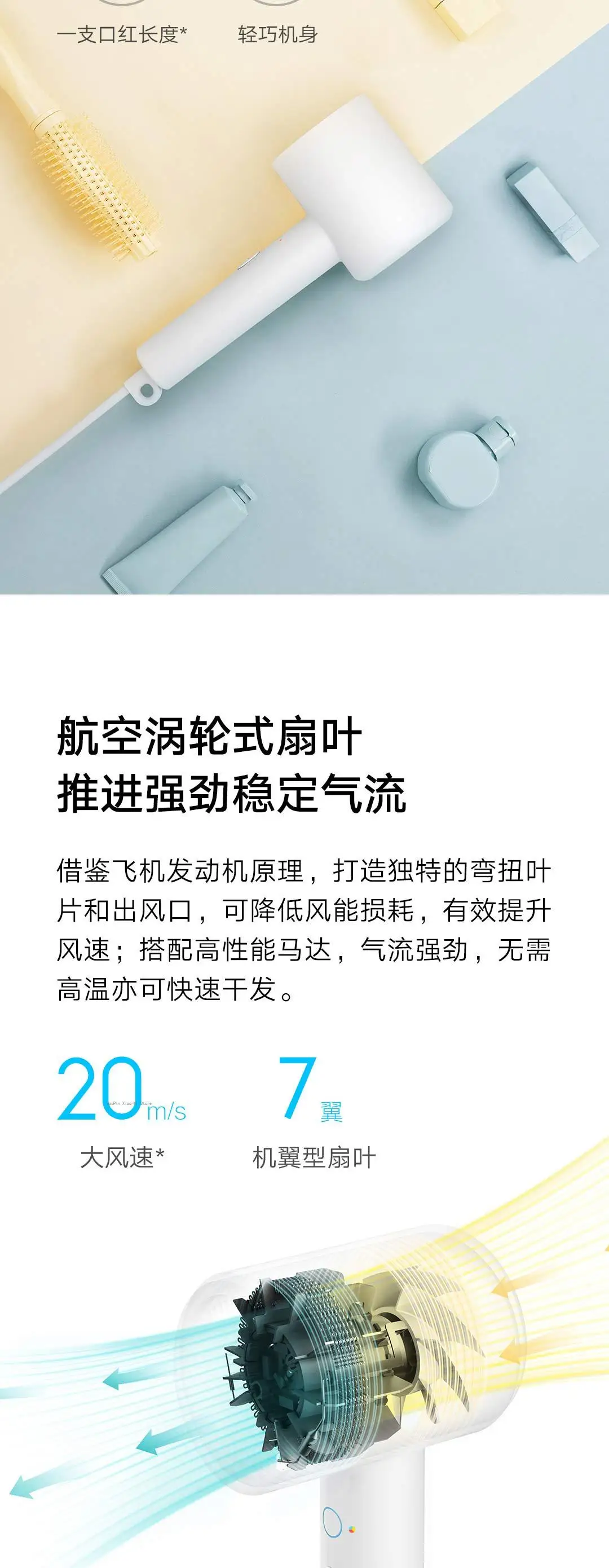 Бренд: Xiaomi Mijia Модель: H300 Цвет: белый Скорость ветра: 20 м/с Номинальная мощность: 1600 Вт Номинальная частота: 50 Гц Номинальное напряжение: AC/220V Вес нетто продукта: 498 г (включая насадку) Размеры: 135 × 77 × 215 мм (включая насадку) Режим ветровой кнопки: выключение питания/мягкий ветер/сильный ветер Режим температуры: холодный ветер/теплый ветер/горячий ветерПосылка