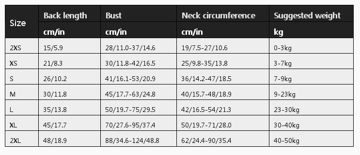 Размер: длина по спине, обхват груди, обхват шеи, рекомендуемый вес