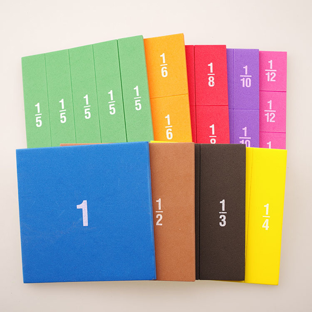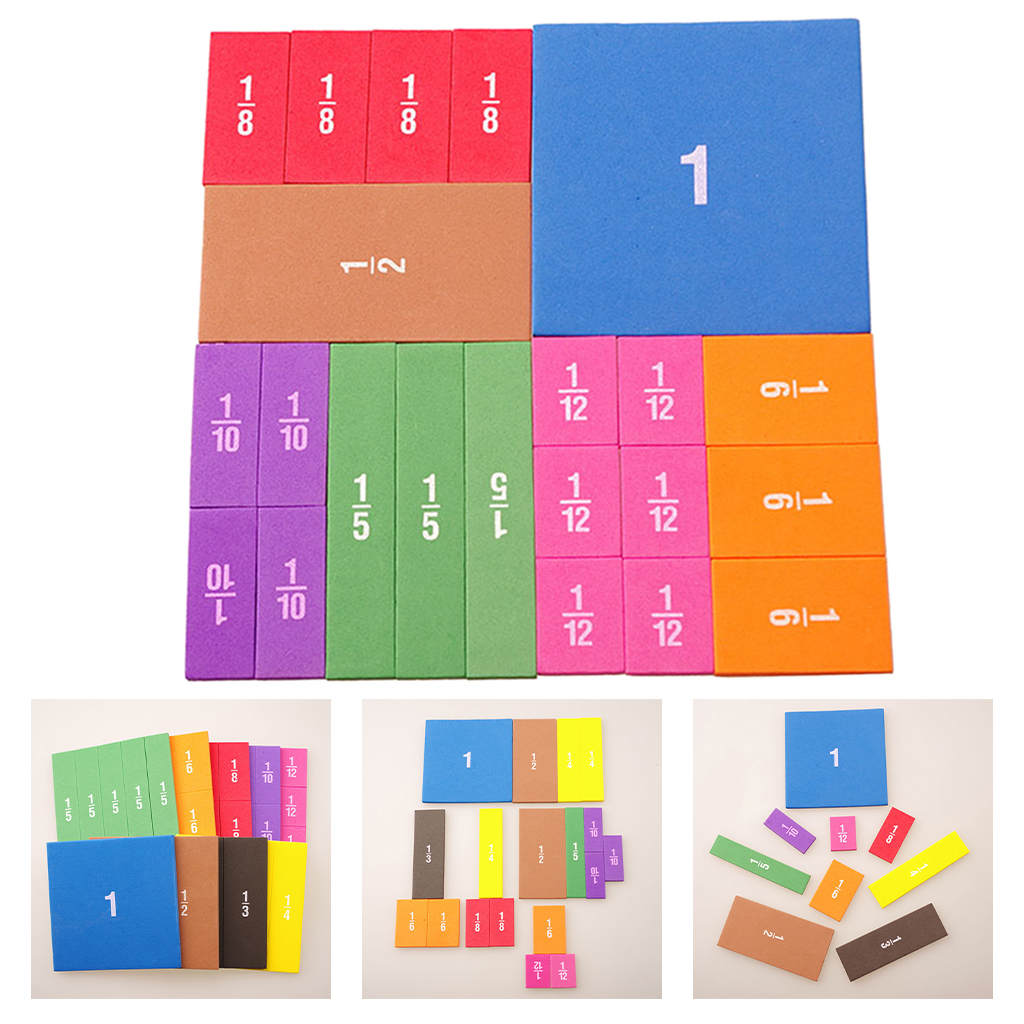 Плитки содержат 1, 1/2, 1/5, 1/6, 1/8, 1/10 и 1/12, всего 22 шт. магнитных сегментов с числами.