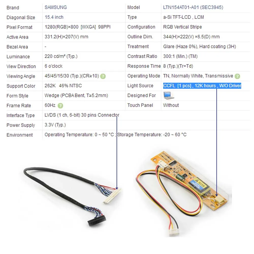 LVDS (1 ch, 6-bit) 30 pins Connector x1 CCFL [1 pcs] x1 pls make sure interfce type of your screen ( the cable and inverter only work the universal circuit board , for example: v29,v59,v56,v53,D3663lua,M.nt68676.2,ect.)