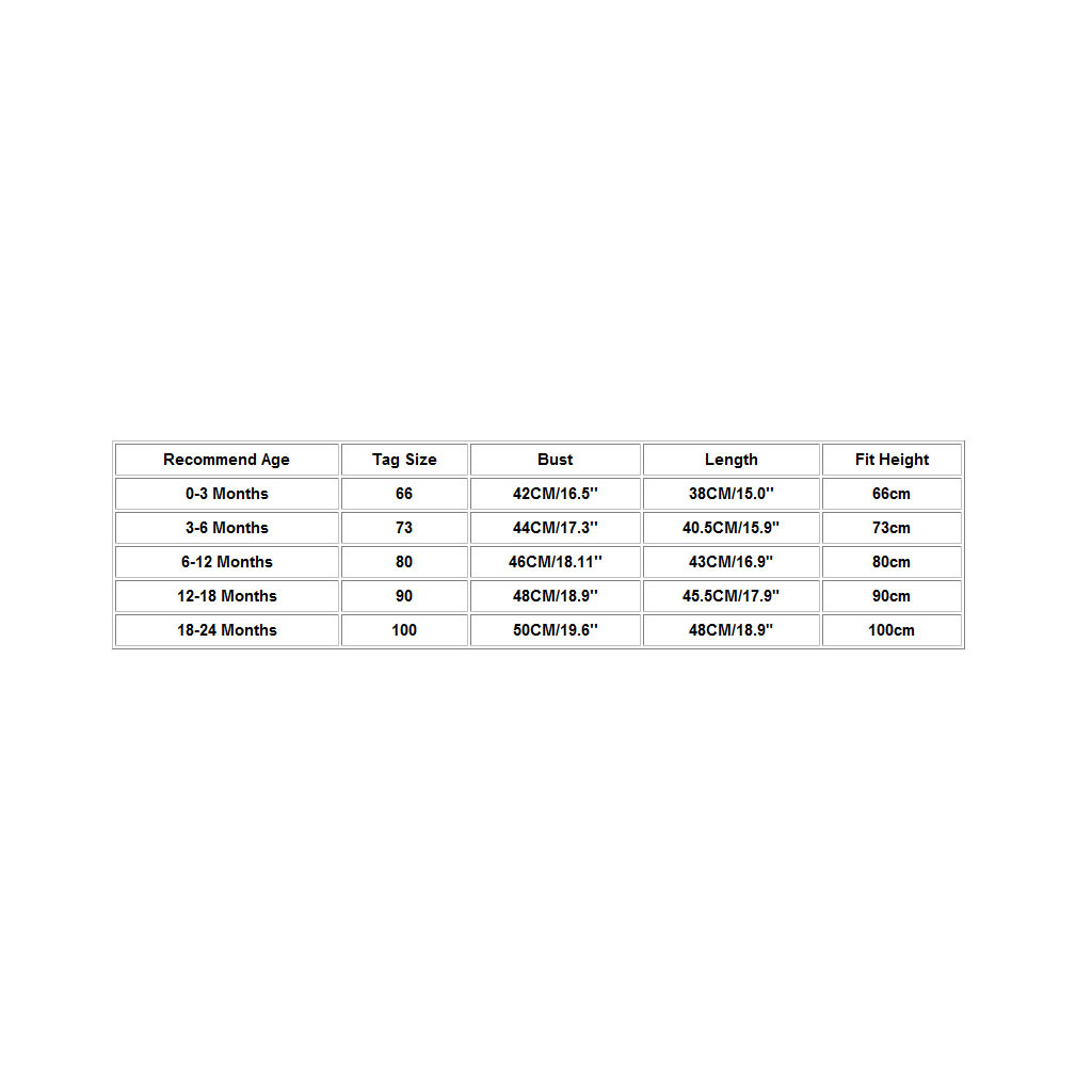 Рекомендуемый возраст Размер бирки Бюст Длина Подходящая высота 0-3 месяца 66 42 см/16,5'' 38 см/15,0'' 66 см 3-6 месяцев 73 44 см/17,3'' 40,5 см/15,9" 73 см 6-12 месяцев 80 46 см/18,11'' 43 см/16,9" 80 см 12-18 месяцев 90 48 см/18,9'' 45,5 см/17,9" 90 см 18-24 месяцев 100 50 см/19,6'' 48 см/18,9" 100 смЗаказал этот набор. Пришло быстро, я не ожидал такой скорости доставки. Впечатление положительное. Качество хорошее, белье не растягивается как бывает... Читать отзыв полностью...