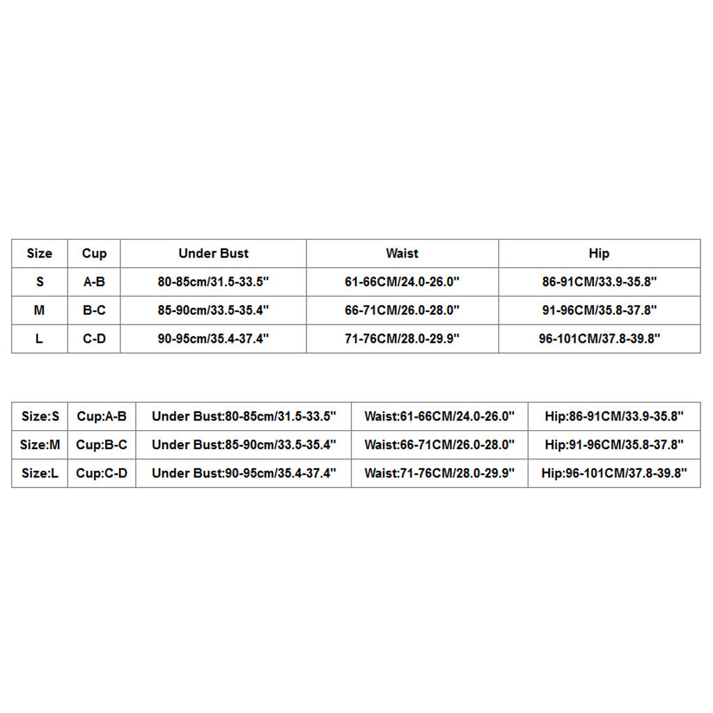 Size Cup Under Bust Waist Hip S A-B 80-85cm/31.5-33.5" 61-66CM/24.0-26.0" 86-91CM/33.9-35.8" M B-C 85-90cm/33.5-35.4" 66-71CM/26.0-28.0" 91-96CM/35.8-37.8" L D 90-95cm/35.4-37.4" 71-76CM/28.0-29.9" 96-101CM/37.8-39.8"
