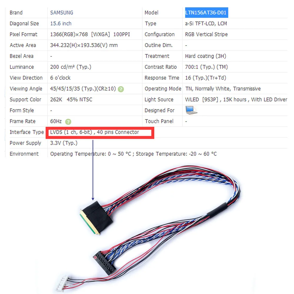LVDS (1 канал, 6 бит), 40 контактов x 1 шт. Пожалуйста, убедитесь, что ваш экран lvds и Тип интерфейса подсветки. Кабель и инвертор работают только на универсальной печатной плате mian, такой как v29 v59 v56 v53 d3663lua и т. Д.