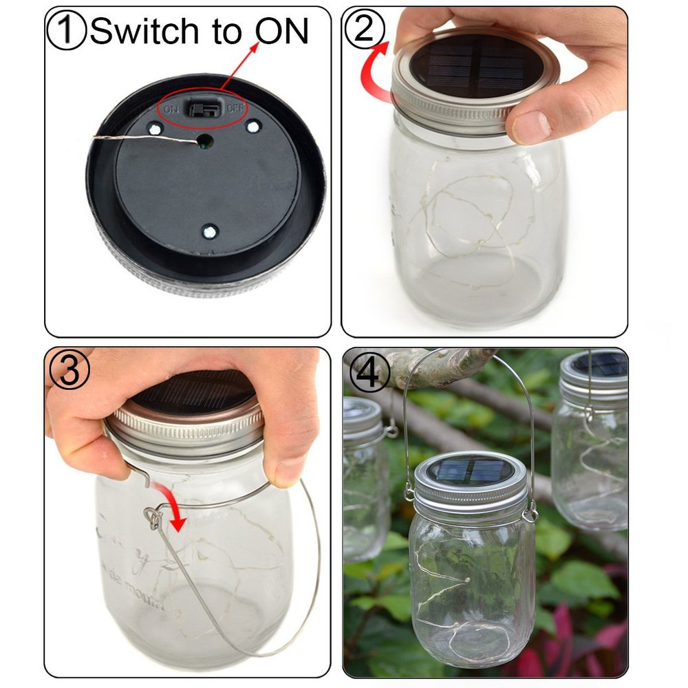 Просто откройте банку и поместите светодиодный светильник на солнечной батарее в кольцо каменщика и закройте крышку, а затем Повесьте светильник на солнце