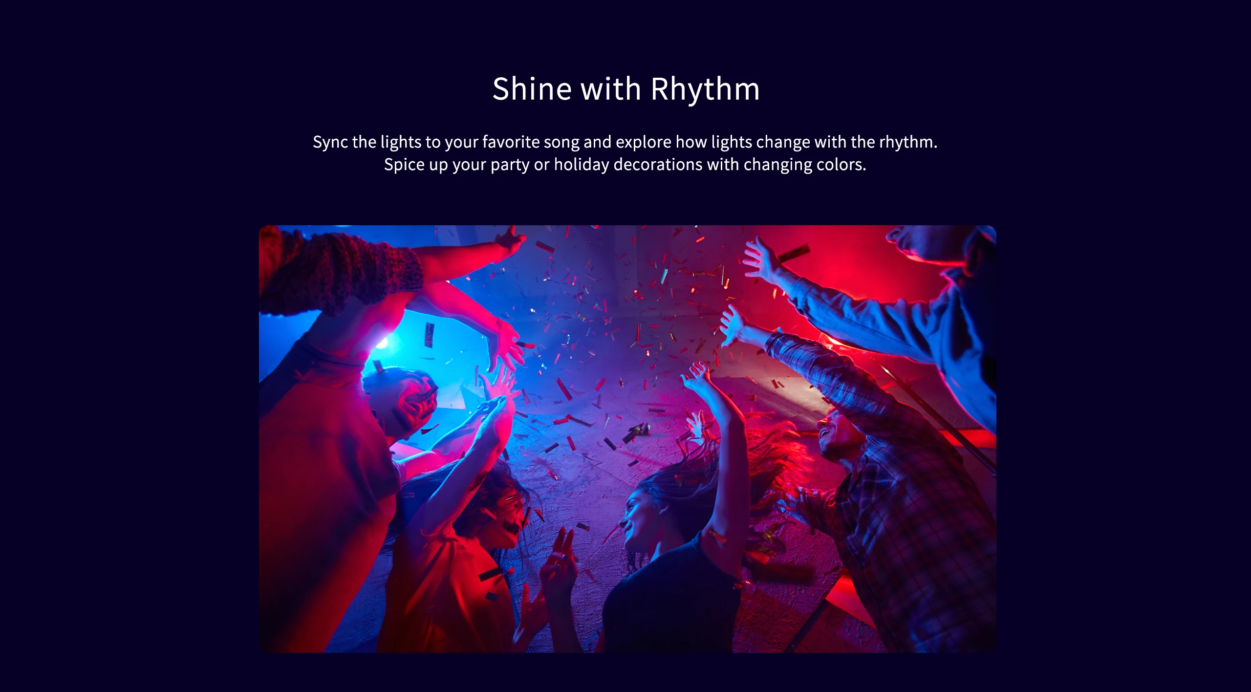 Синхронизируйте свет с вашей любимой песней и исследуйте, как лампы меняются с ритмом. Оживите вечерние украшения или украшения для праздников с помощью меняющихся цветов.