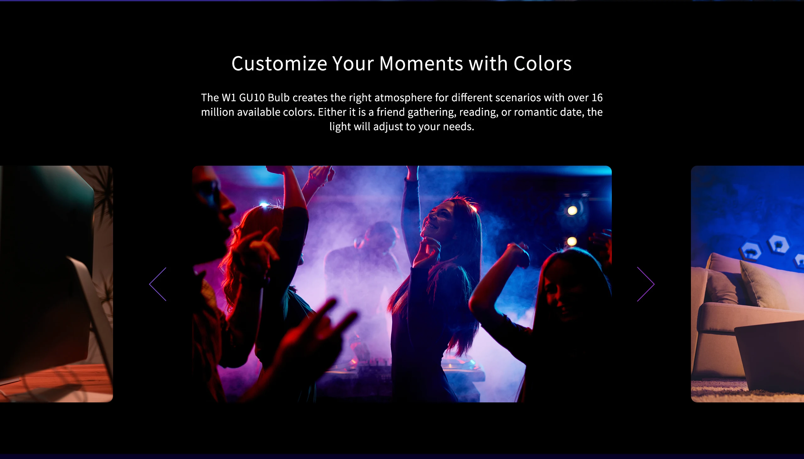 Лампа W1 GU10 создает правильную атмосферу для различных сценариев с более чем 16 миллионов доступных цветов. Либо это встреча друзей, чтение или романтическое свидание, светильник будет адаптироваться к вашим потребностям.