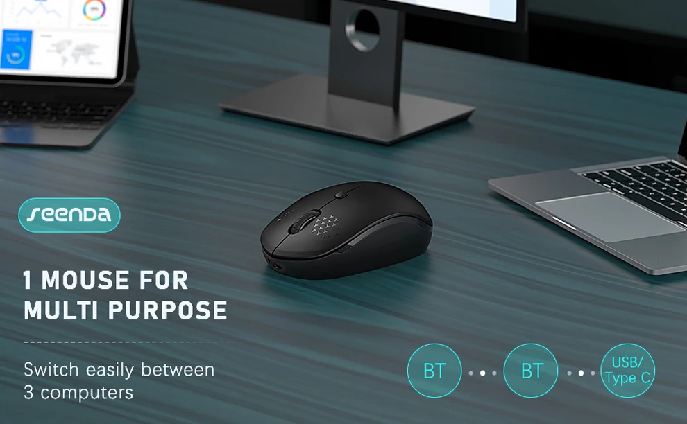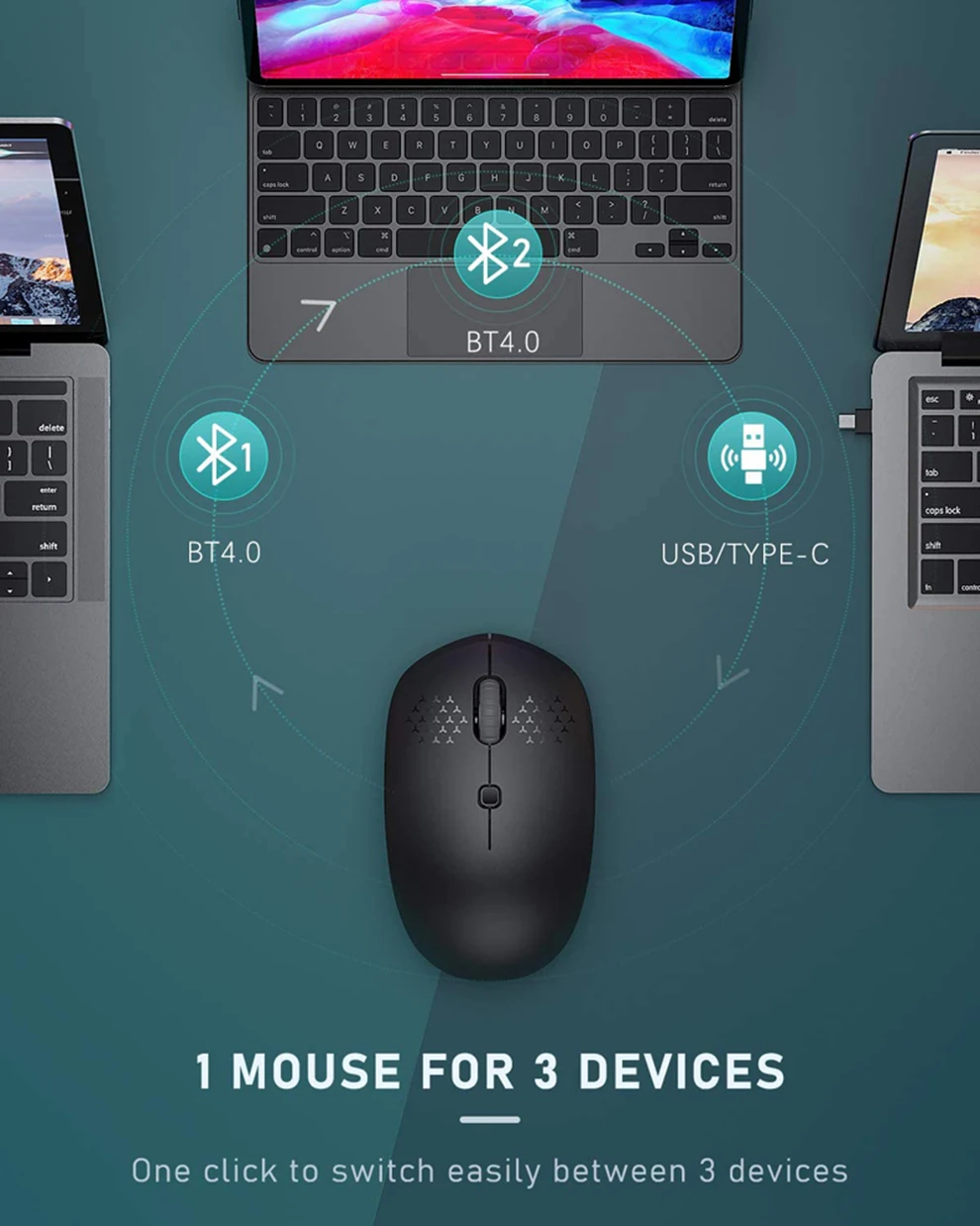 2020 MULTI DEVICE BLUETOOTH MOUSE- There are three ways to connect the mouse: 2*Bluetooth 4.0 and 1*USB/Type-C (2 in 1 receiver). Supporting up to 3 devices simultaneously and you can switch between Bluetooth and USB wireless devices by a slight press. Once set up, you can switch between the devices back and forth as you like. Perfect for those needing to operate multiple devices