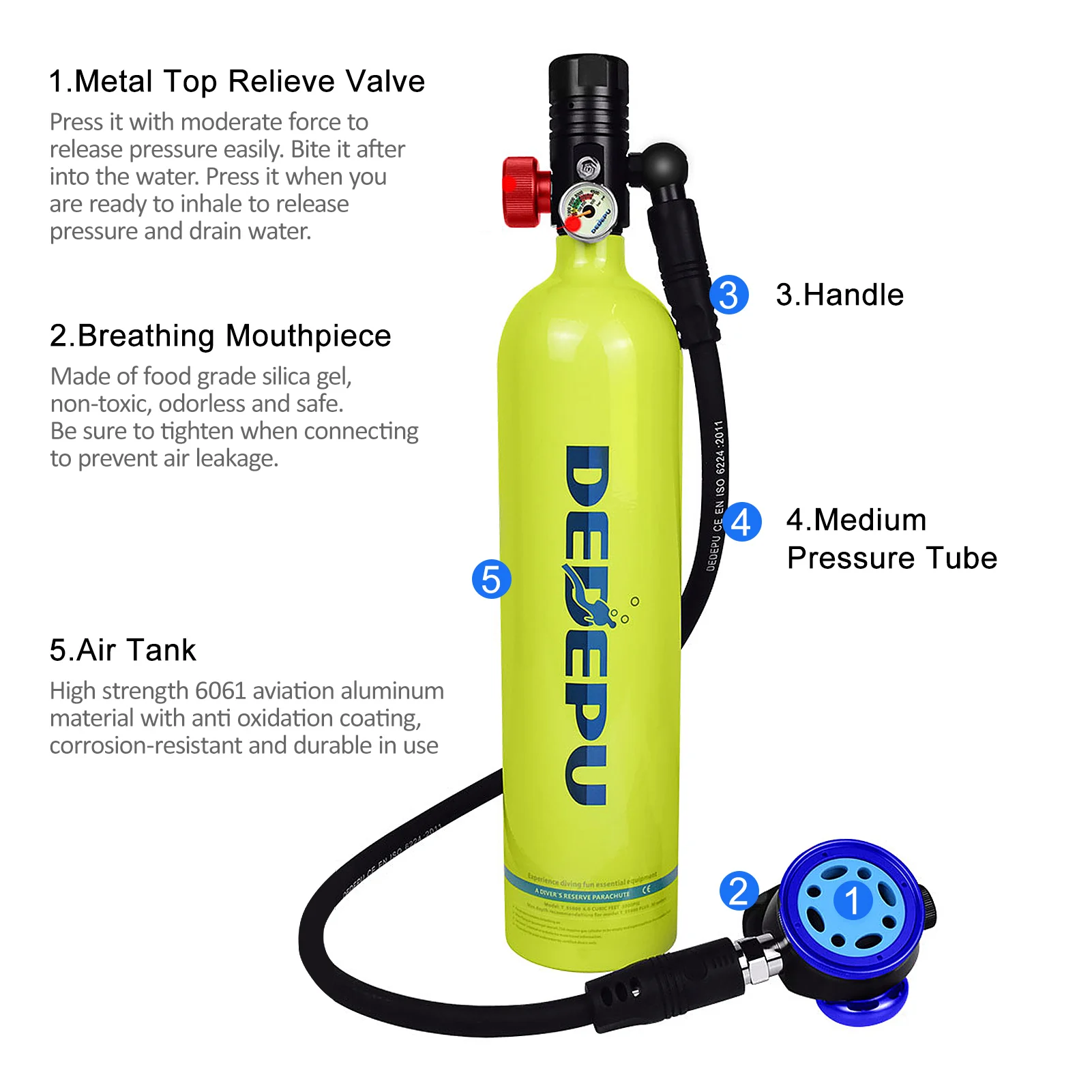С емкостью 1 л, используется для 300 подводных вдохов на полной мощности и более 20 минут погружения (разные для каждого человека).