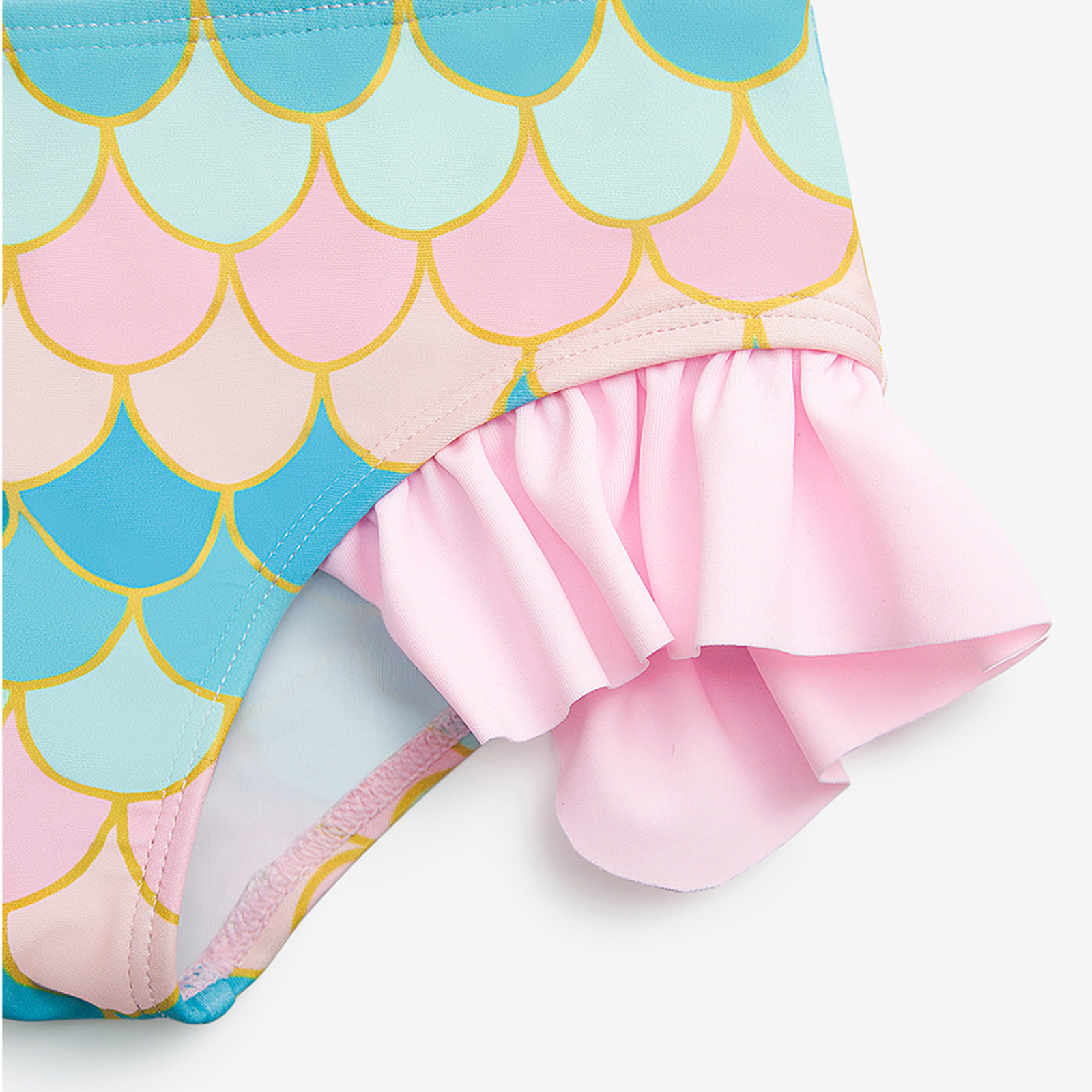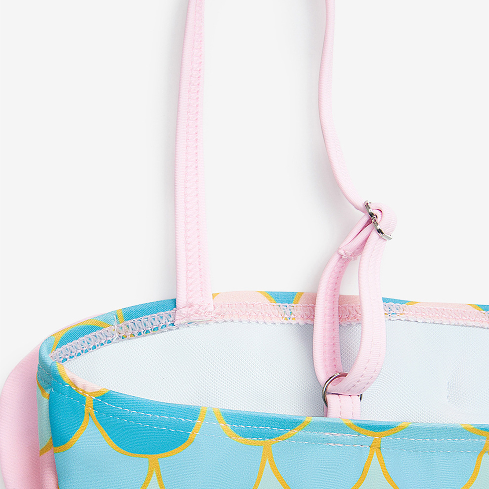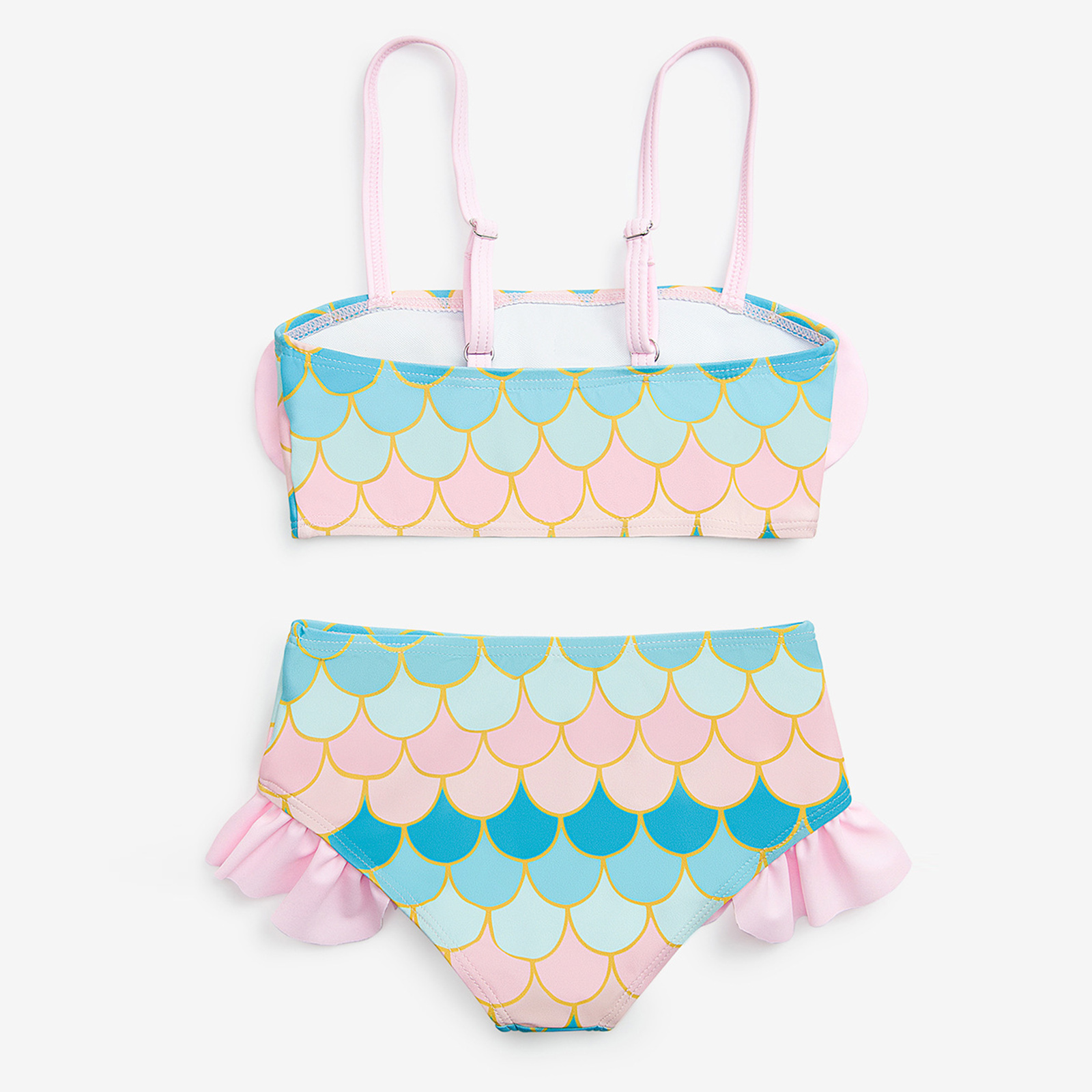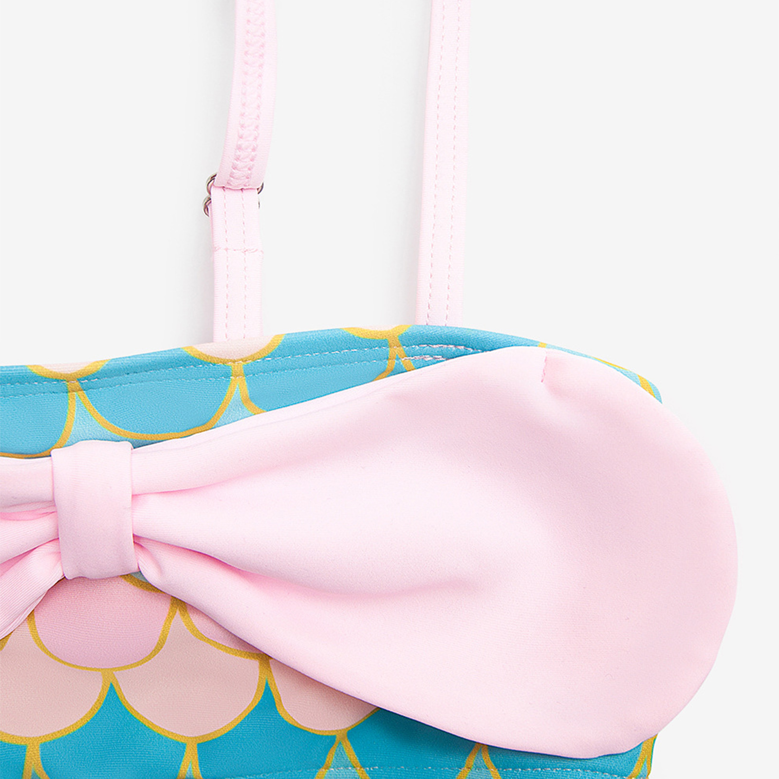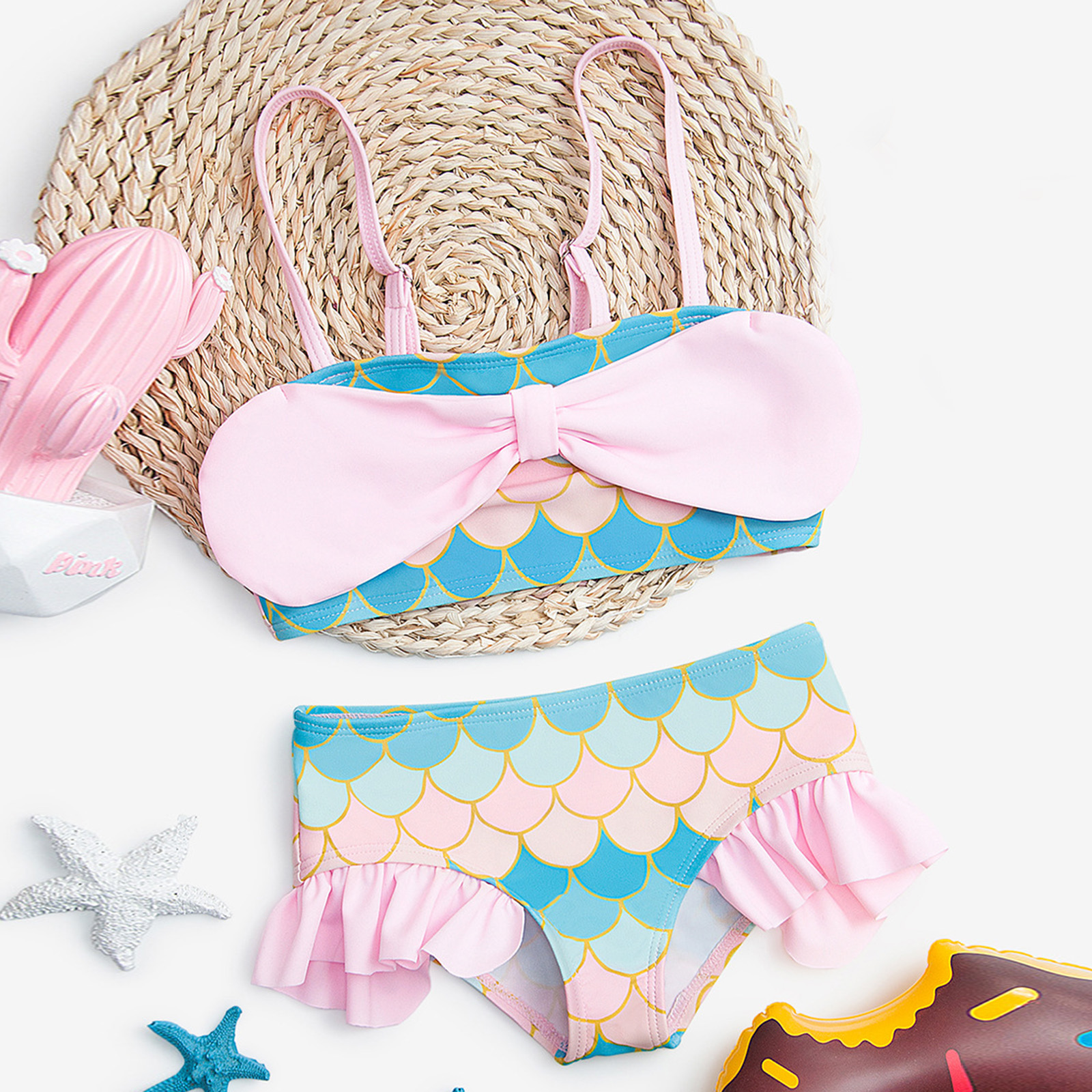 Регулируемые купальные топы на лямках, спереди с большим прошитым бантом, трусы с обеих сторон с милыми рюшами. Принт рыбьей чешуи как принцессы.
