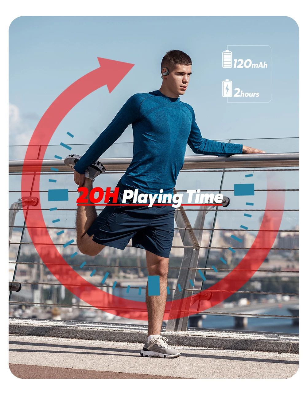 20 часов непрерывной воспроизведения музыки, достаточно для того, чтобы носить весь день, поэтому вам больше не нужно беспокоиться о батарее