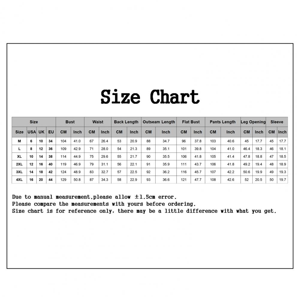 [Наши Размеры XL] Обхват голенища: 47,8 см/18,8 ", рукав: 47 см/18,5", брюки Длина: 105 см/41,3 ", обхват талии: 75 см/29,5'', длина наружного шва: 90 см/35,4 дюйма, наружный Бюст: 57 см/22,4 дюйма, длина внутреннего шва: 55 см/21,7 дюйма, внутренний бюст: 106 см/41,7 дюйма (прибл.)