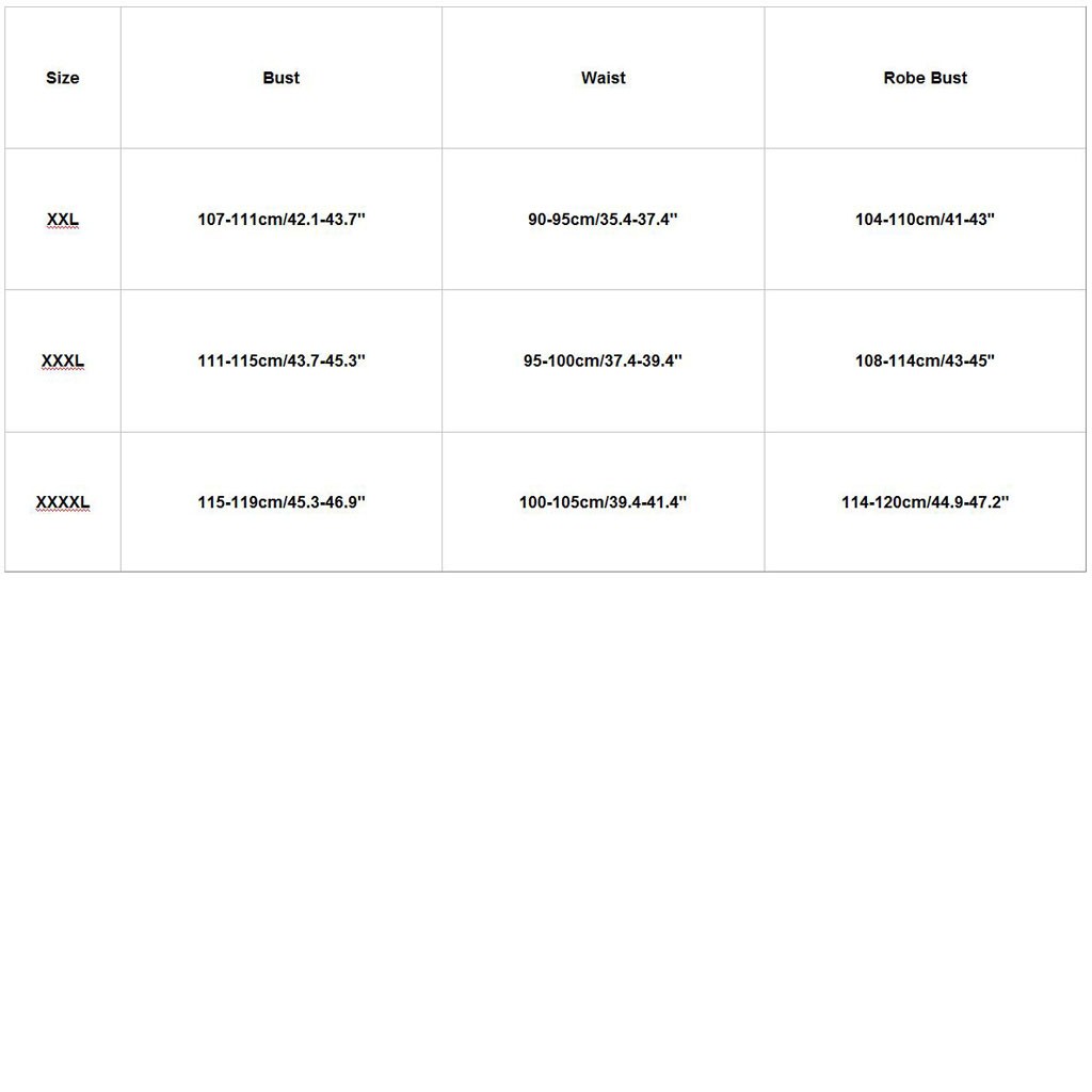 Размеры Бюст Талия Халат, бюст XXL 107-111 см/42,1-43,7" 90-95 см/35,4-37,4" 104-110 см/41-43'' XХХL 111-115 см/43,7-45,3" 95-100 см/37,4-39,4" 108-114 см/43-45'' XXXXL 115-119 см/45,3-46,9" 100-105 см/39,4-41,4" 114-120 см/44,9-47,2"