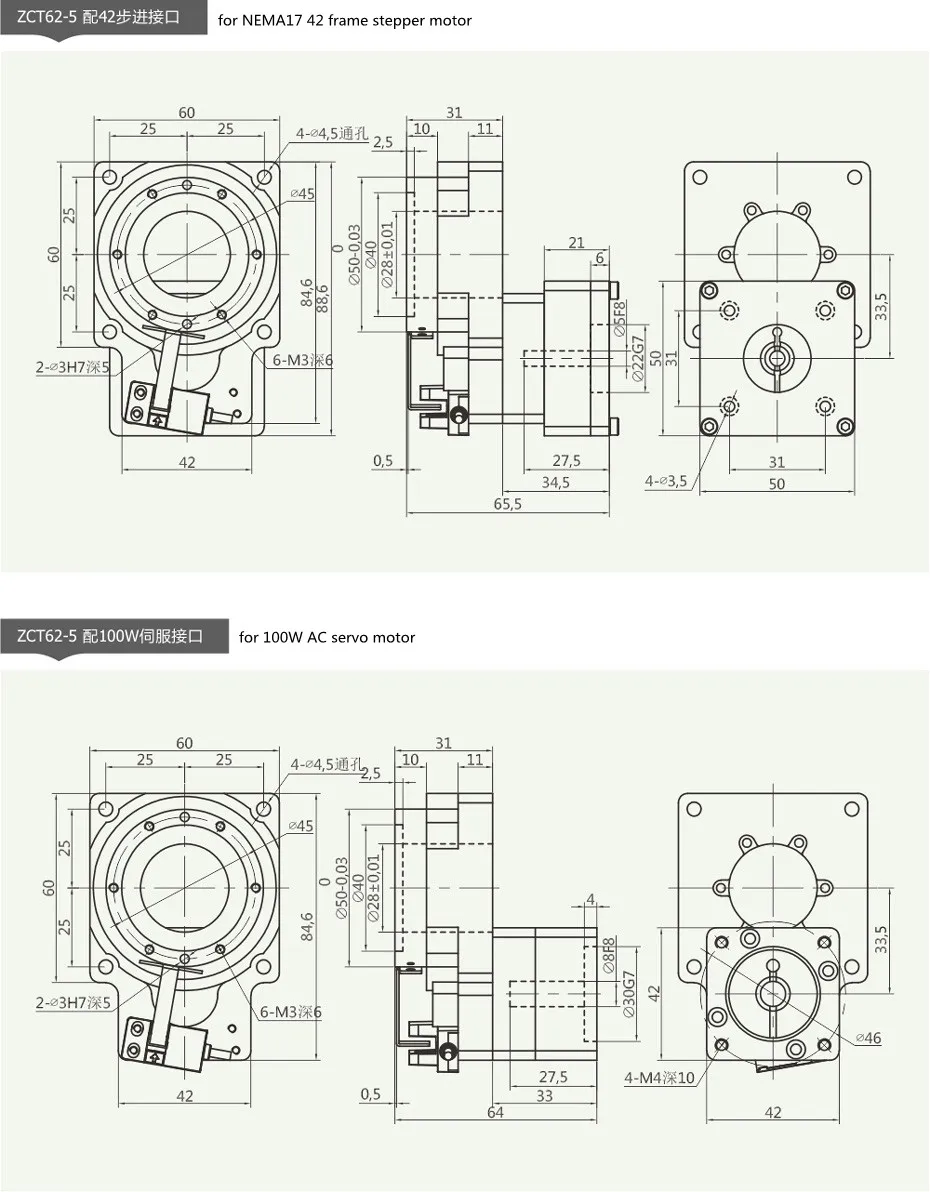 Характеристики продукта: небольшой размер, большой момент нагрузки, низкий уровень шума, высокая точность позиционирования и возможность позиционирования под любым углом. Поворотный стол представляет собой полая конструкция с максимальной апертурой 150 мм, что удобно для установки в арматуре газовых труб и проводов. Так же, как делитель и двигатель DD, нагрузку можно непосредственно зафиксировать на полой поворотной платформе для передачи, которая подходит для различных марок серводвигателей и шаговых двигателей.