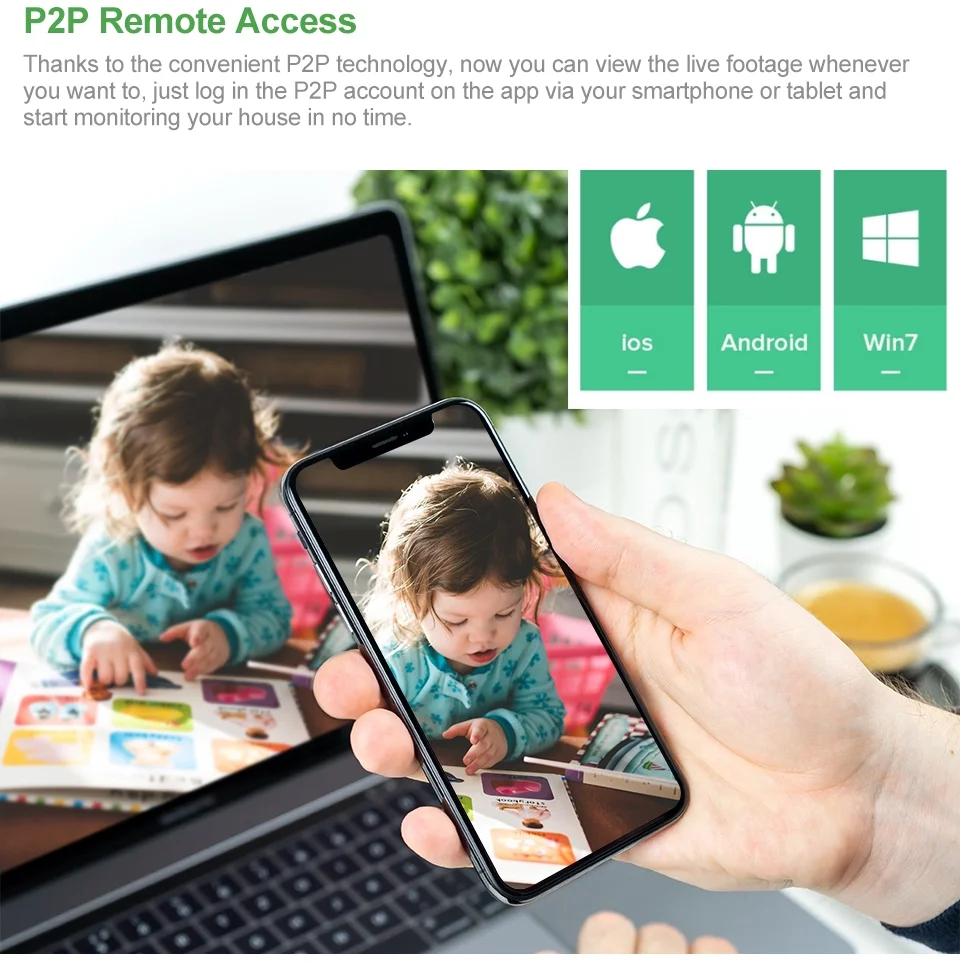 4. Поддержка сигнализации обнаружения движения, двухстороннее аудио непосредственно на ваш смартфон, планшет или windows PC, слот для sd-карты для локальной записи или Onvif NVR, воспроизведение онлайн.