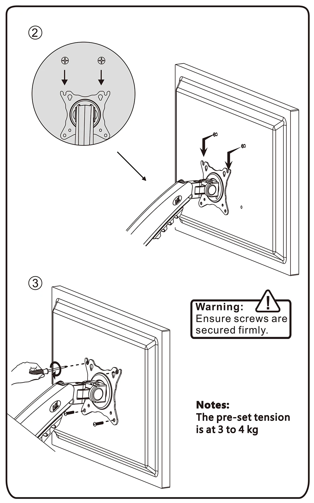 Loading: 2.0-9.0kgs (4.4-19.8lbs) (Pls make sure weight of your screen is within this range, or the gas spring arm cannot work!)
