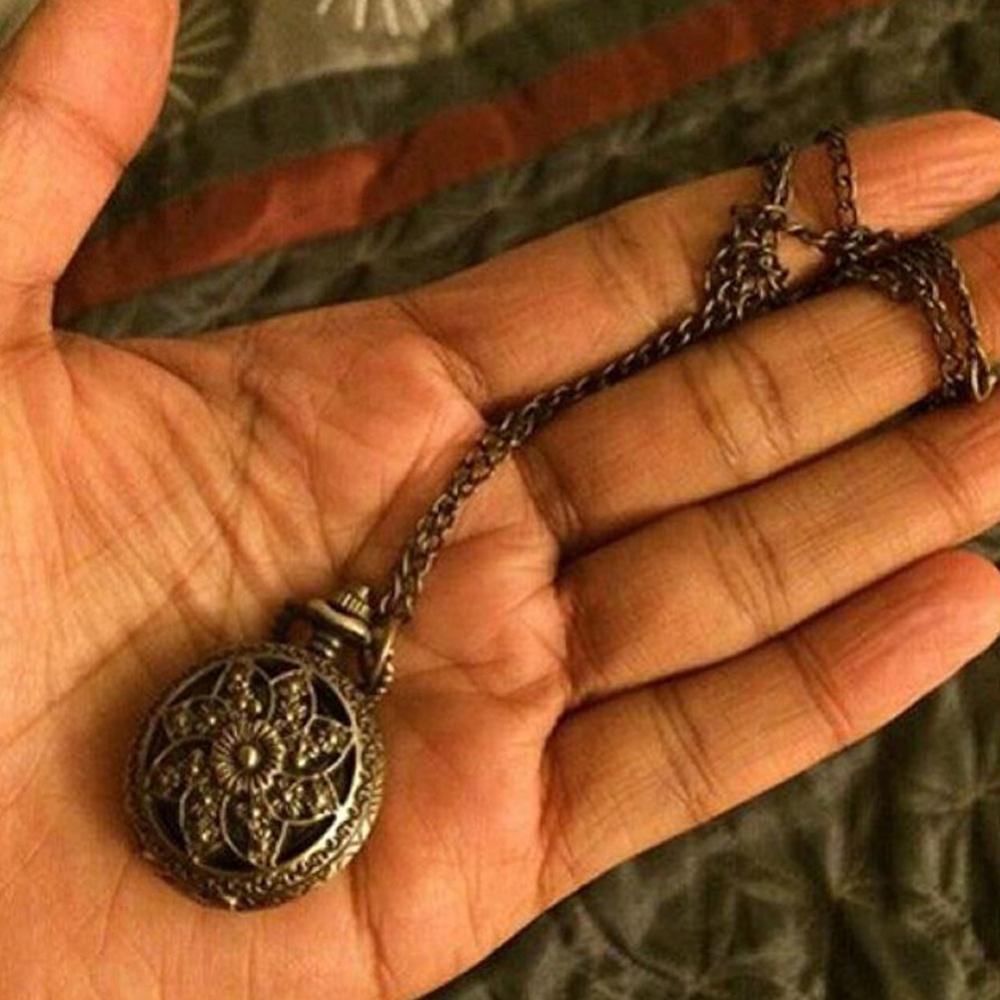 Особенности: резной чехол, полый, бронзовый тон, с цепочкой