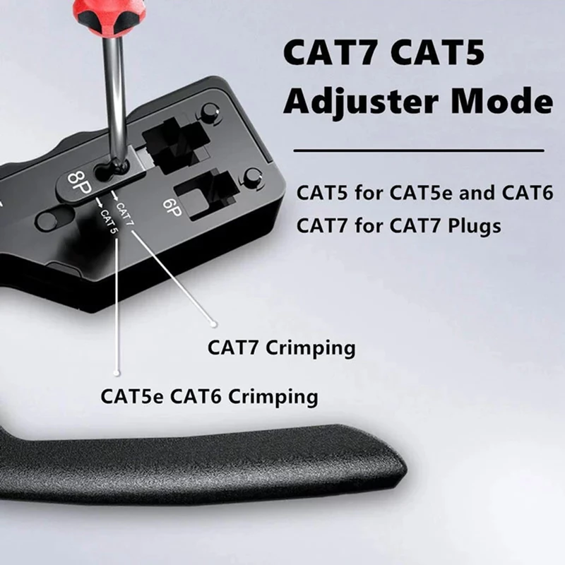 Built-in Cat7 to Cat5 Switcher - Switch from Cat7 to Cat5 crimping by using a screwdriver to loosen then switch up or down to change the compression mode. Enables you to crimp both shielded CAT6a connectors as well as standard RJ45 connectors. The Cat7 mode stands for Cat7 shielded plugs crimping. Cat5 mode stands for Cat5e and Cat6 plugs crimping.