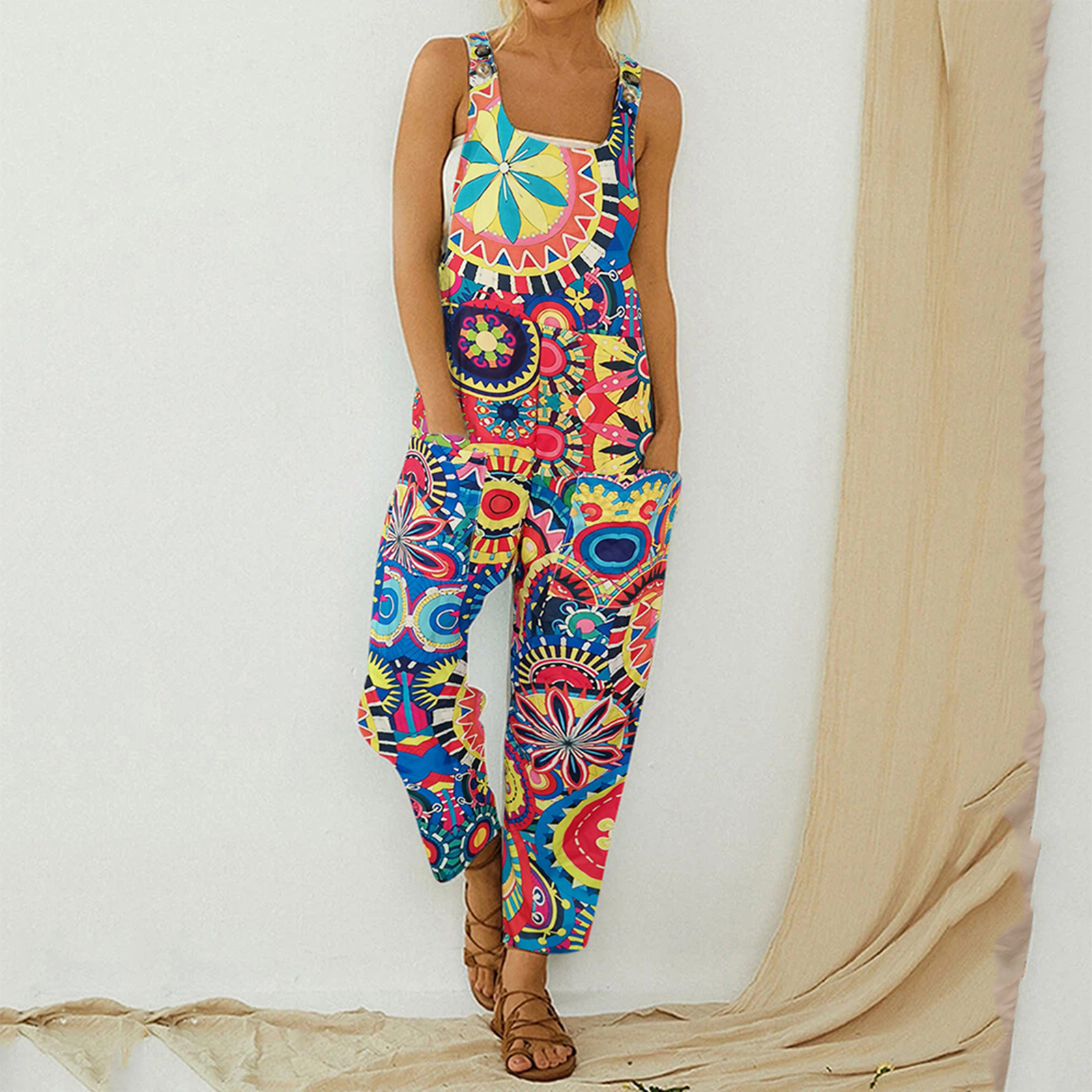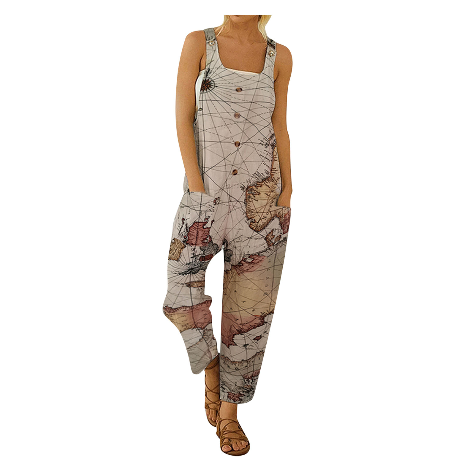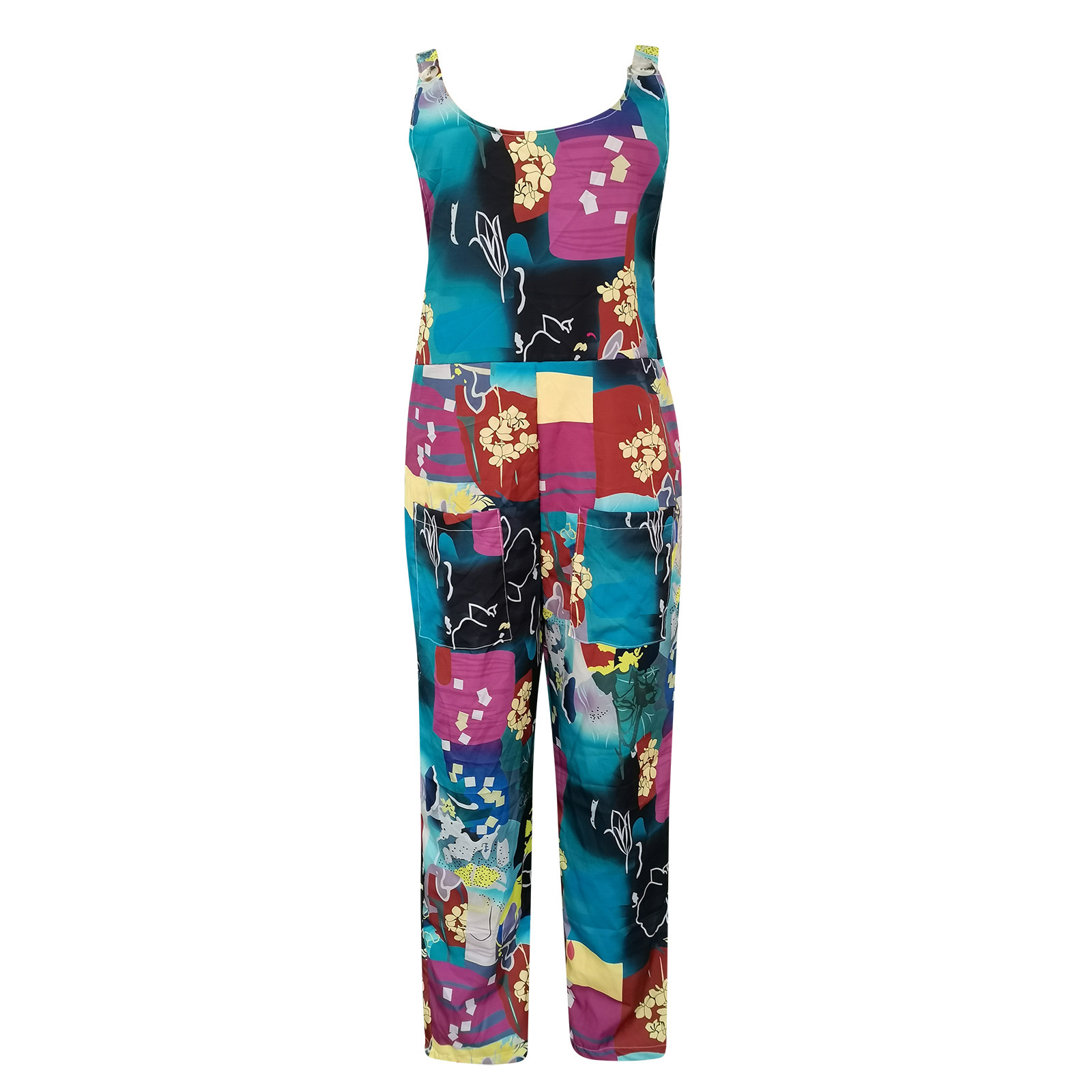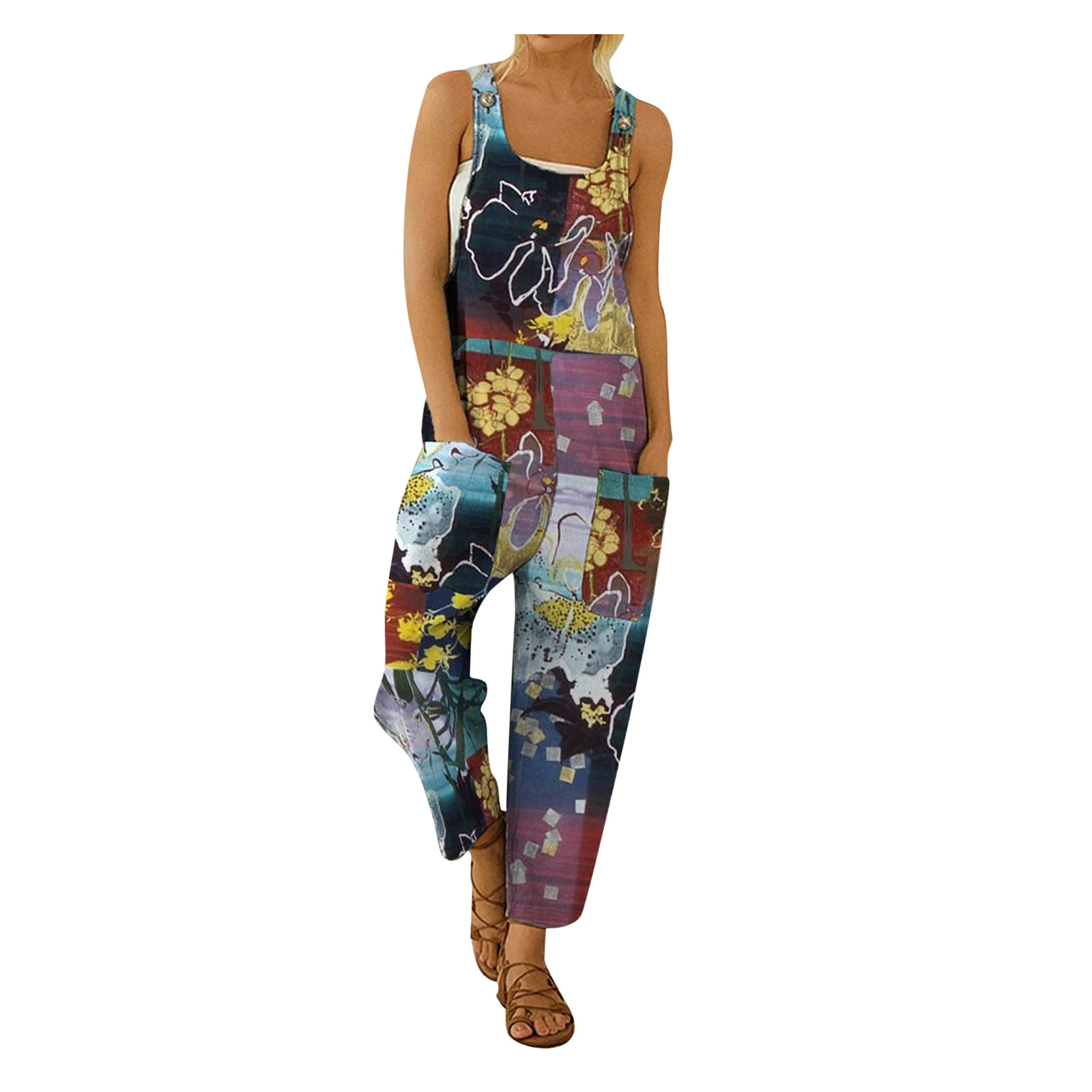 Женский модный комбинезон с карманами, Длинный летний комбинезон с принтом в стиле ретро, Свободный комбинезон на бретелях без рукавов, 2021